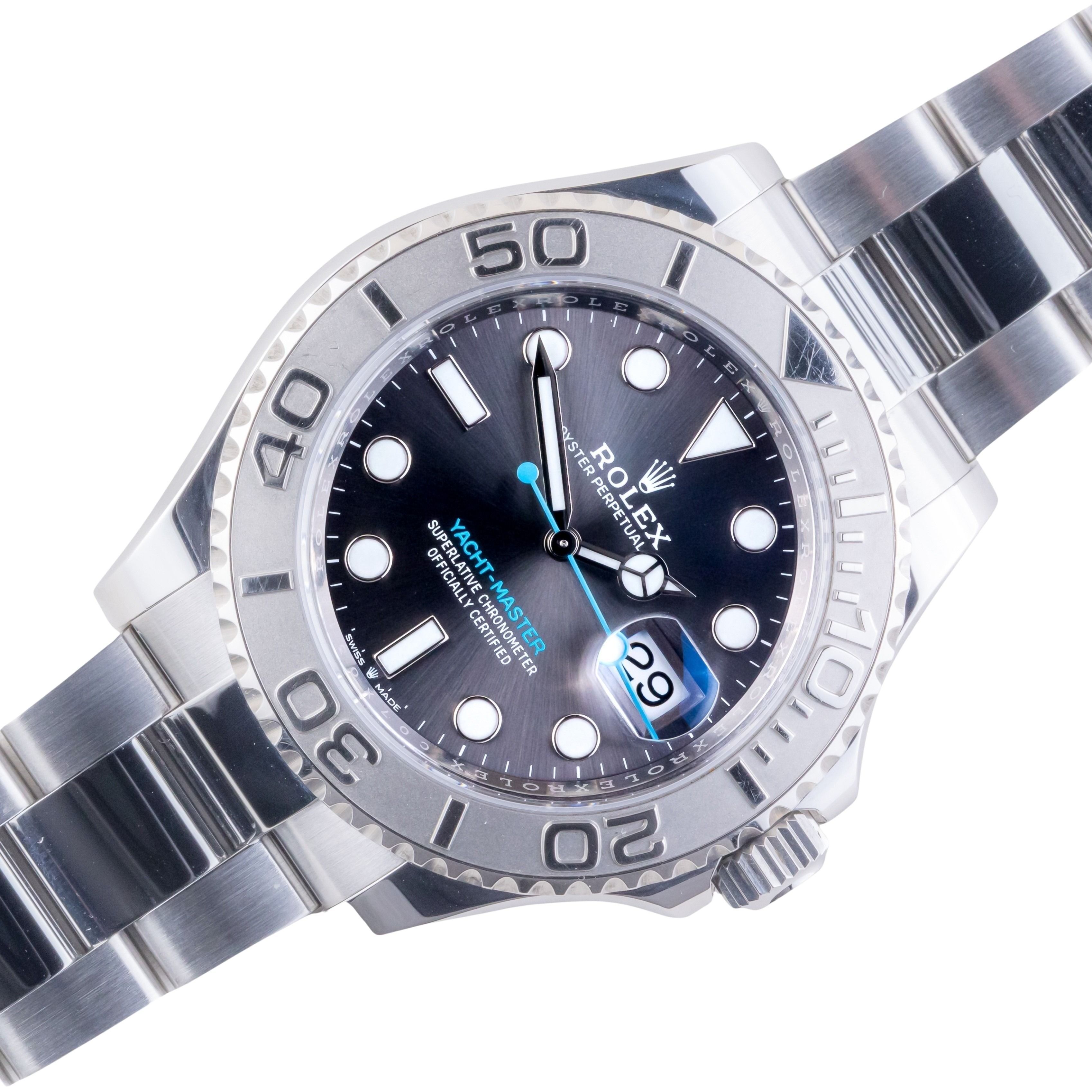 Rolex Oyster Perpetual Yacht-Master Référence 126622 de 2022, comprenant l'ensemble complet. Le Yacht-Master 126622 mesure un boîtier en acier inoxydable de 40 mm, un bracelet Oyster en acier inoxydable avec fermoir Oysterlock et une lunette bidirectionnelle en platine. Le Yacht-Master 126622 est équipé d'un mouvement automatique calibre 3235 avec fonction de date rapide, d'un verre saphir résistant aux rayures et d'un cadran de couleur rhodium avec affichage Chromalight.