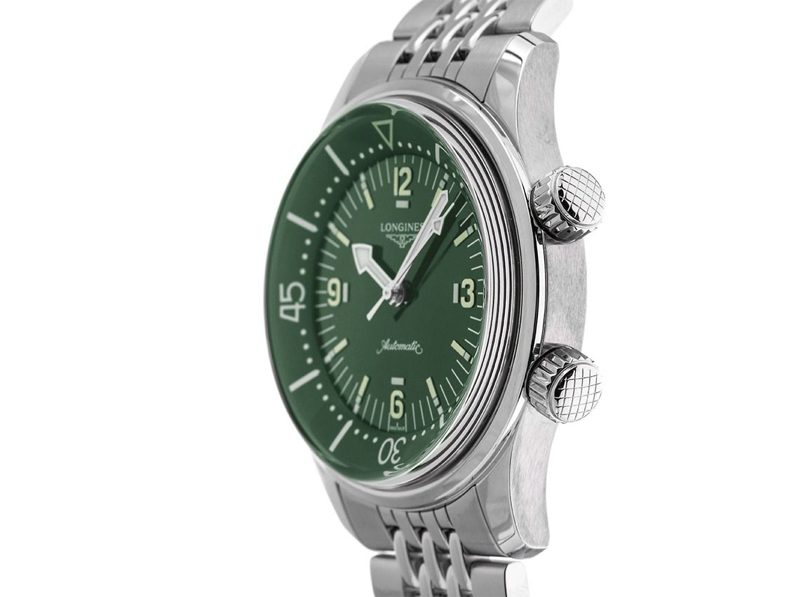 Longines Legend Diver Stahl Automatik Armband StahlGehäuse Edelstahl poliert, Gehäusedurchmesser ohne Krone 39mm, Gehäusehöhe 12,7mm. Lünette Unterglas beidseitig drehbar über verschraubbare Krone bei 2 Uhr. Armband Edelstahl poliert und satiniert, Sicherheitsfaltschließe Edelstahl mit Hersteller-Logo. Zifferblatt grün mit arabischen Leuchtziffern und Leuchtindexen sowie versilberten polierten Zeigern. Uhrwerk Automatik, Longines Kaliber L888, Gangreserve ca. 72 Stunden. Anzeige von Stunde, Minute und Sekunde über Zeiger aus der Mitte mit Sekundenstopp zur sekundengenauen Einstellung der Uhrzeit. Saphirglas kratzfest. Krone verschraubbar bei 4 Uhr. Boden Edelstahl verschraubt und graviert. Gewicht der Uhr inklusive Armband 145g, Länge des Armbandes inklusive Gehäuse 215mm. Wasserdicht bis 30 ATM. Referenznummer: L3.764.4.06.6, ID: ST610244401125RE-3700, Artikelnummer: 10000083500. Original Longines Box mit Umkarton und Garantie Papiere von 2025 sowie Beschreibung, Full Set. Ungetragen. Lieferzeit sofort.