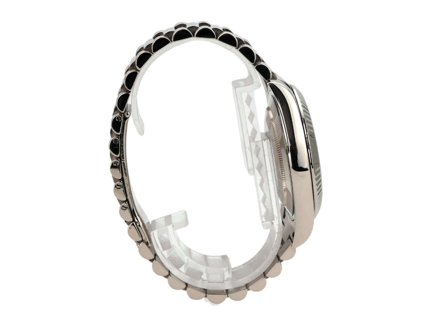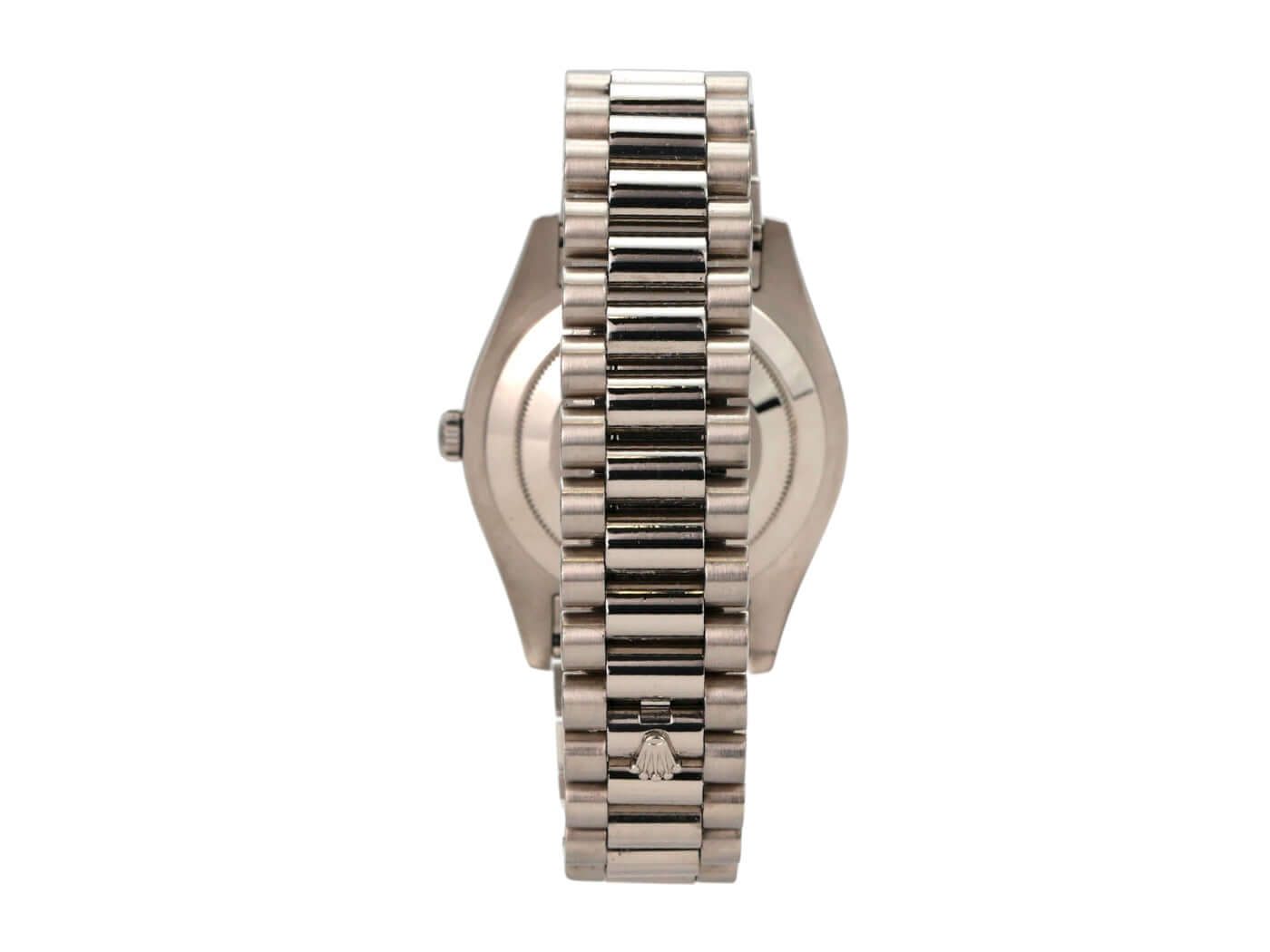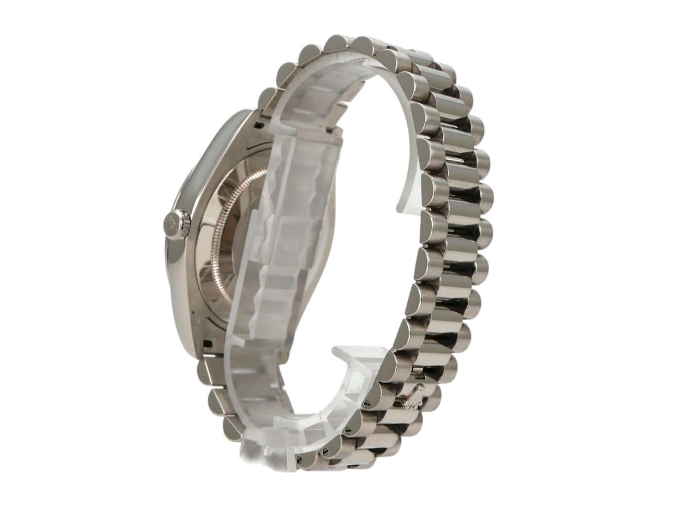 Boîtier en or blanc 18 ct, poli et satinée, diamètre du boîtier 41 mm, lunette en or blanc 18 ct, cannelée, bracelet President en or blanc 18 ct, poli et satinée avec fermoir dépliant, cadran gris avec chiffres arabes appliqués, mouvement automatique, chronomètre, calibre Rolex manufacture 3156 avec 31 rubis, fréquence 28 800 A/h, affichage de la date avec loupe à 3 heures, affichage du jour de la semaine à 12 heures, verre saphir résistant aux rayures, couronne vissée, fond de boîtier vissé en or blanc 18 ct, étanche jusqu'à 10 bar.