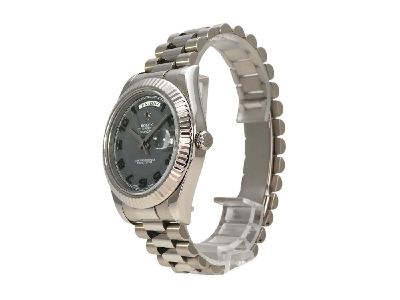 Rolex Day-Date II 218239 White Gold Gray ArabicCase made of 18 kt white gold, polished and satin-finished, case diameter 41 mm, bezel made of 18 kt white gold, fluted, President bracelet made of 18 kt white gold, polished and satin-finished with folding clasp, gray dial with applied Arabic numerals, automatic movement, chronometer, Rolex manufacture caliber 3156 with 31 jewels, frequency 28,800 A/h, date display with magnifying glass at 3 o'clock, weekday display at 12 o'clock, scratch-resistant sapphire crystal, screw-down crown, screw-down case back made of 18 kt white gold, water-resistant up to 10 bar.