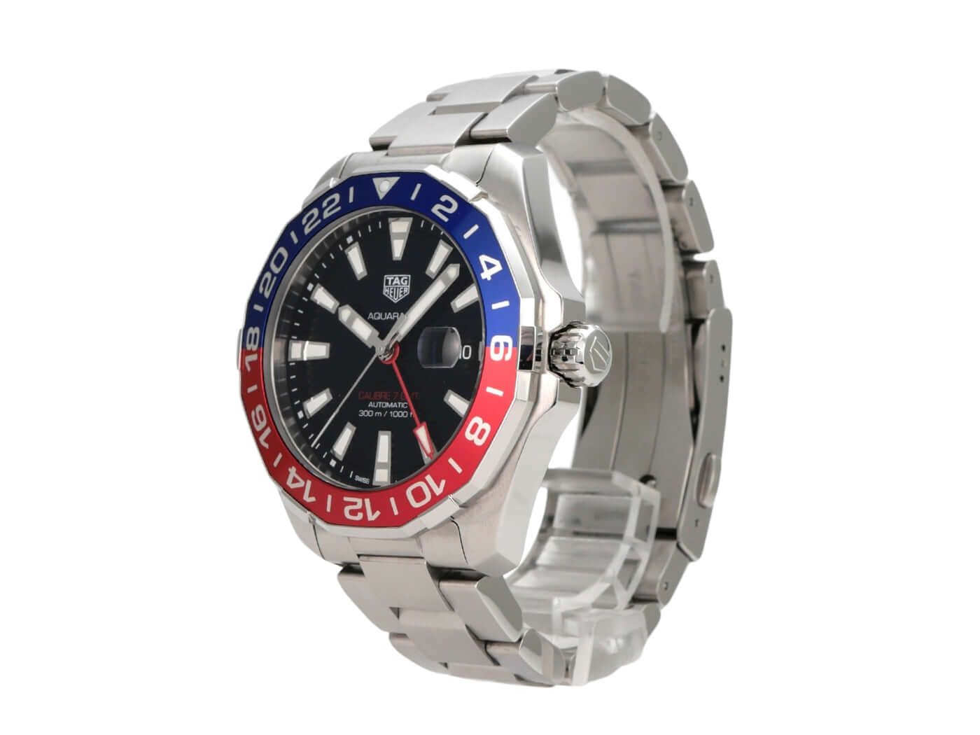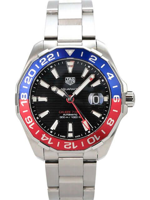 TAG Heuer Aquaracer Calibre 7 WAY201F.BA0927 Twin-TimeCase made of satin-finished stainless steel, case diameter 43 mm, satin-finished stainless steel bezel with red-blue insert, satin-finished stainless steel bracelet with folding clasp, black dial with applied luminous indices, luminous hands, automatic movement, caliber Tag Heuer 7, date display, GMT/second time zone, sapphire crystal, stainless steel back, water-resistant up to 30 bar.