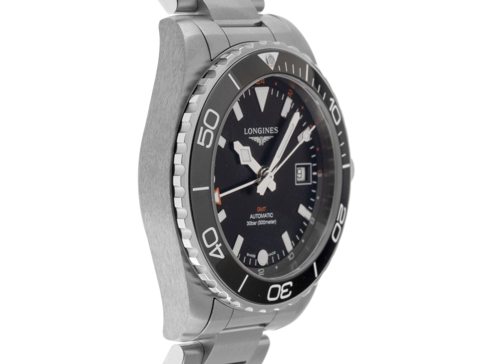 Boîtier en acier inoxydable poli et satiné, diamètre du boîtier sans couronne 43mm, hauteur du boîtier 12,9mm. Lunette en acier inoxydable avec insert en céramique noire, graduation de 60 minutes et point lumineux, unidirectionnelle. Bracelet en acier inoxydable poli et satiné, fermoir déployant de sécurité en acier inoxydable avec logo du fabricant. Cadran noir avec index lumineux appliqués et aiguilles lumineuses polies. Mouvement automatique, calibre Longines L844, réserve de marche d'environ 72 heures. Affichage des heures, minutes et secondes par aiguilles centrales avec stop-seconde pour un réglage précis de l'heure, affichage de la date avec réglage rapide à 3 heures, GMT (deuxième fuseau horaire). Verre saphir résistant aux rayures. Couronne vissée avec protection latérale et logo du fabricant. Fond en acier inoxydable vissé et gravé. Poids de la montre avec bracelet 182g, longueur du bracelet avec boîtier 210mm. Étanche jusqu'à 30 ATM. Numéro de référence : L3.790.4.56.6, ID : ST610239001225H-3250, numéro d'article : 10000083533. Boîte Longines originale avec carton d'emballage et papiers de garantie de 2025 ainsi que description, Full Set. Non porté. Délai de livraison immédiat.