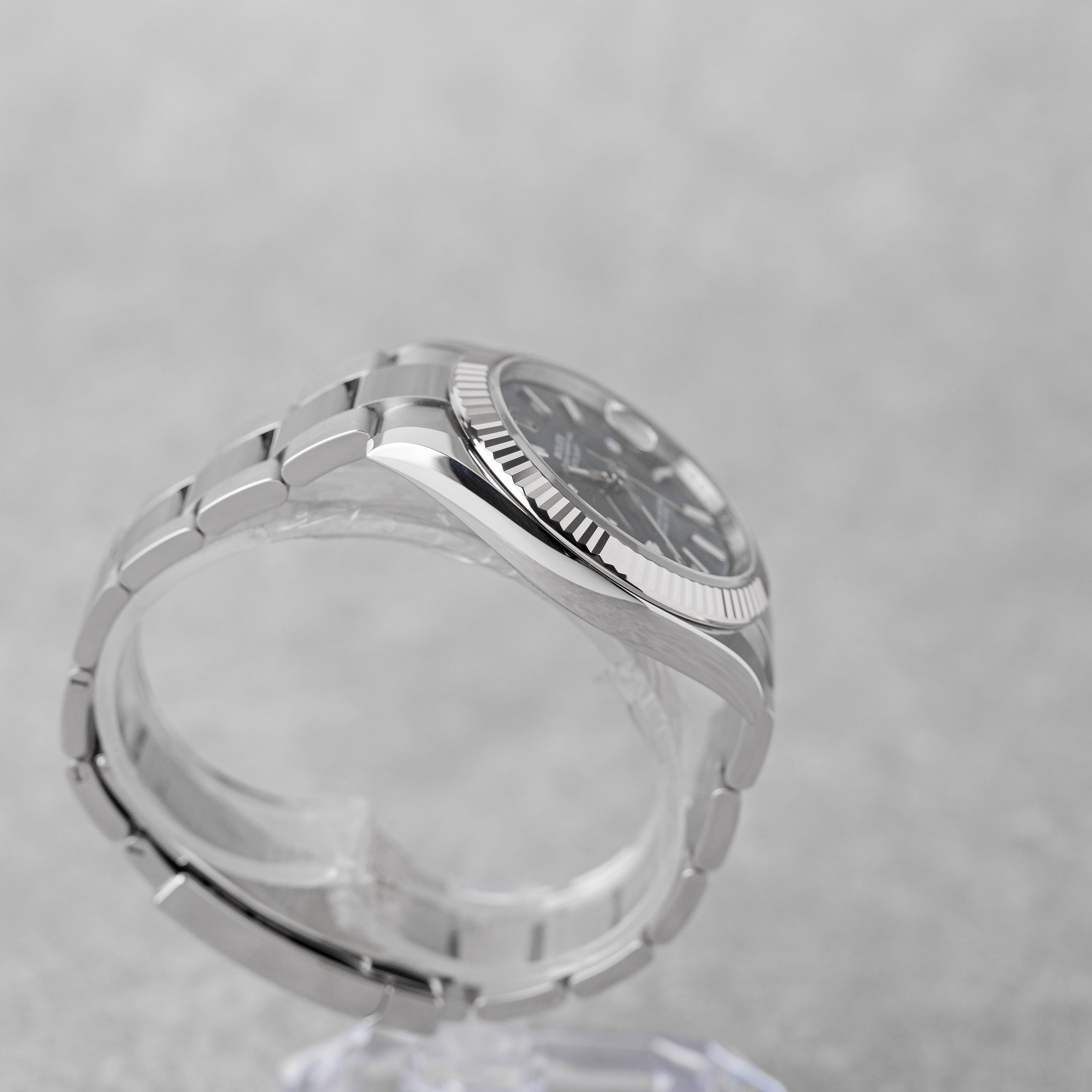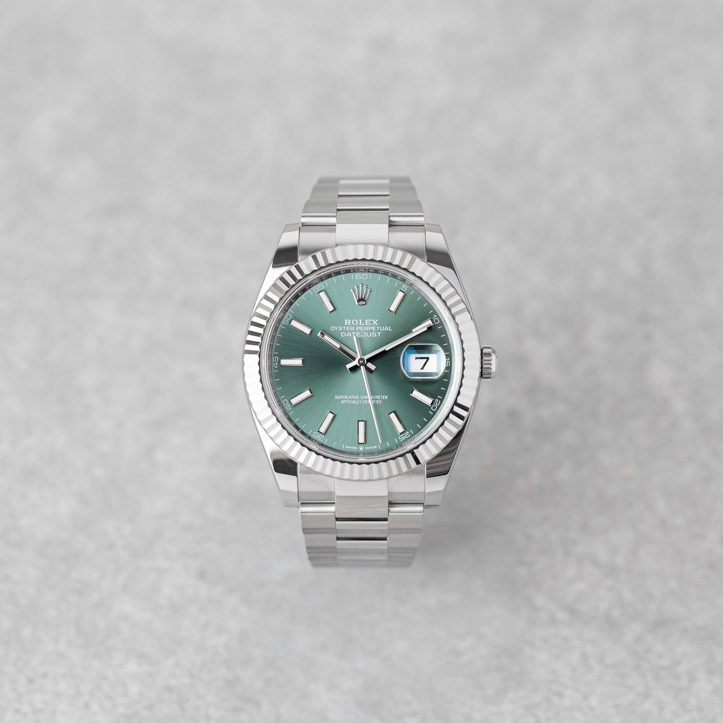 The Rolex Datejust 41 ref. 126334 with green dial features a 41mm stainless steel case, a white gold fluted bezel and a refined oyster bracelet, enhancing its classic appeal. Powered by the Rolex Caliber 3235 automatic movement, it offers a 70-hour power reserve with outstanding accuracy. This full set, like new from Feburary 2024, is ideal for those seeking a blend of elegance, comfort, and durability.