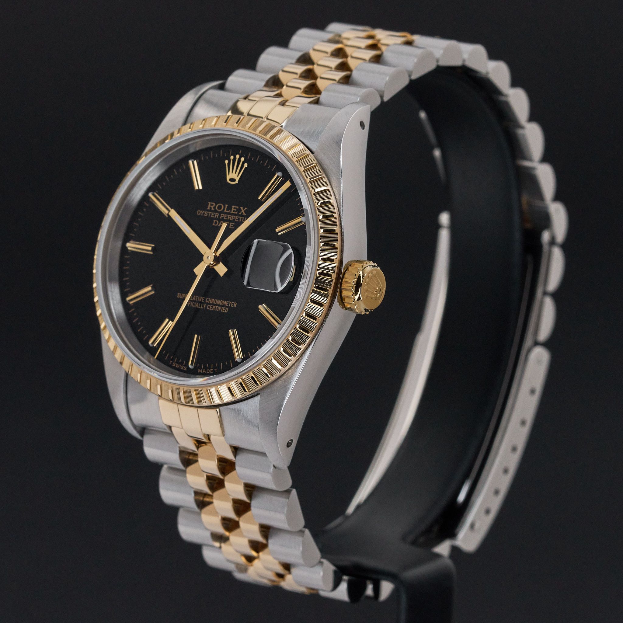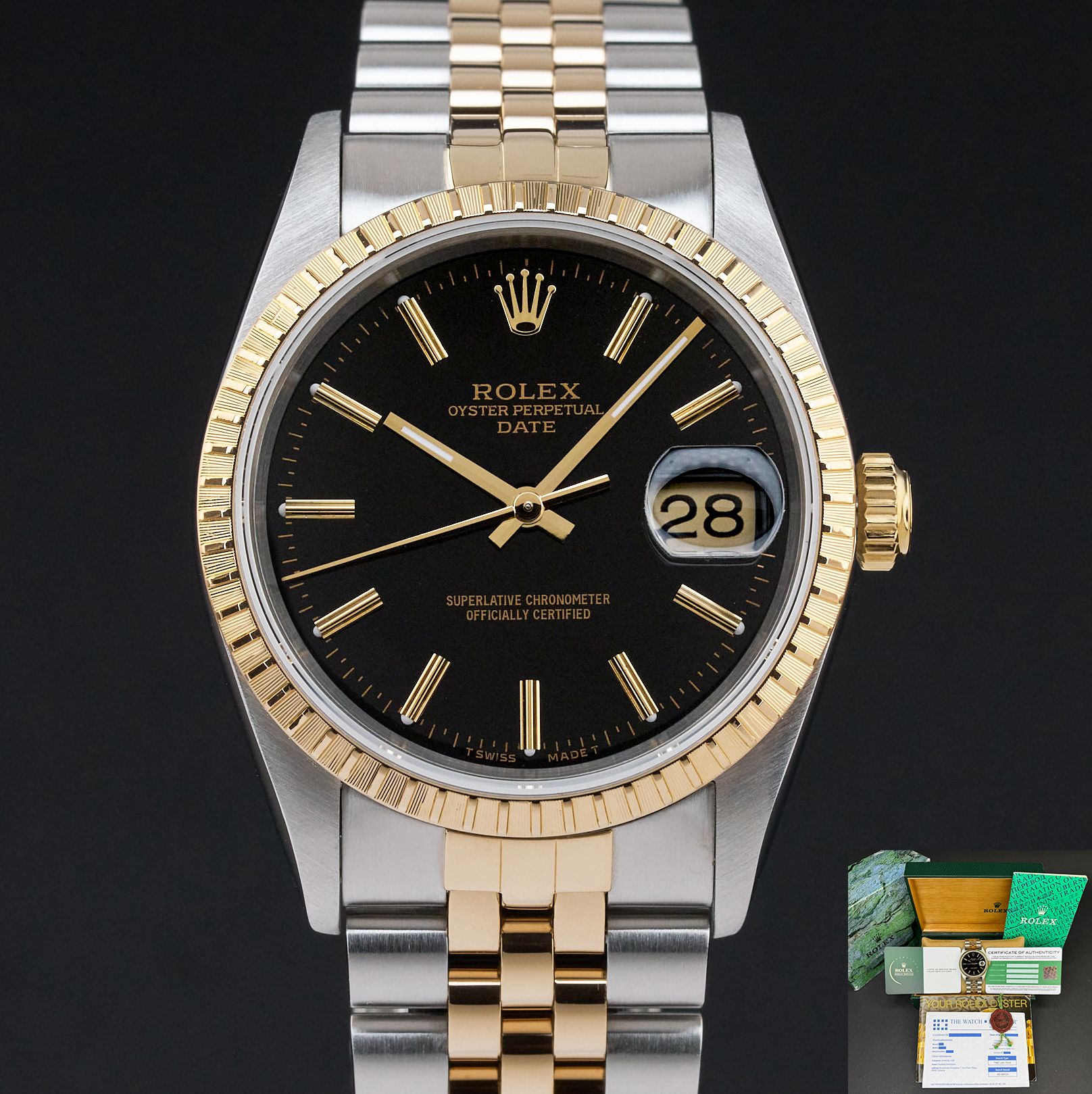 Rolex Oyster Perpetual Date, 15223, 34mm, 1990, Two-Tone, Black dial, Box & Papers, Official warranty