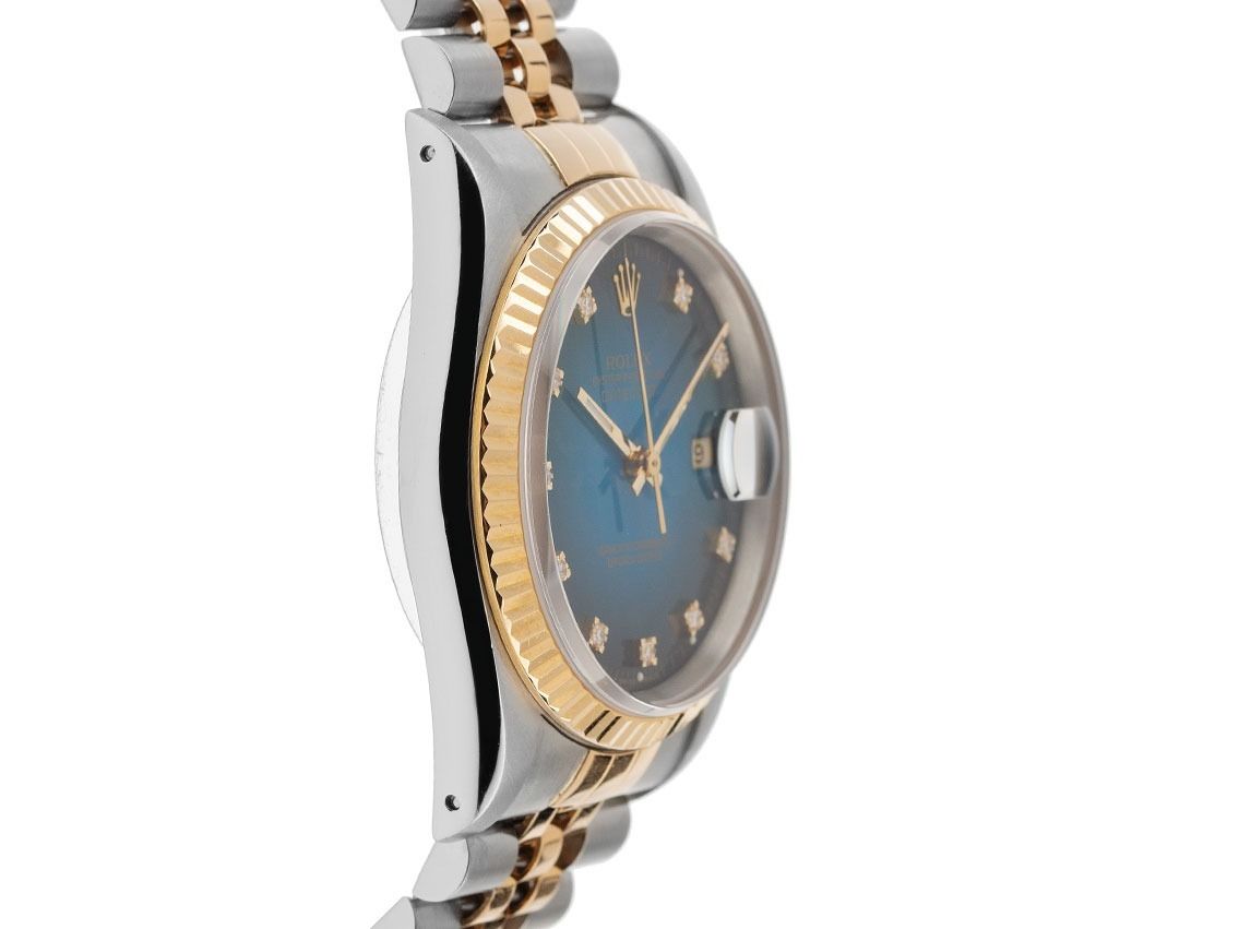 Boîtier en acier poli et satiné, diamètre du boîtier sans couronne 36mm, hauteur du boîtier 11,6mm. Lunette en or jaune 18kt poli et striée. Bracelet Jubilé en acier / or jaune 18kt poli et satiné, fermoir déployant en acier avec logo du fabricant. Cadran dégradé bleu / noir avec 10 index en diamants sertis en or jaune et aiguilles en or jaune. Mouvement automatique, chronomètre avec certificat, calibre manufacture Rolex 3135 avec 31 pierres précieuses. Affichage de l'heure, des minutes et des secondes par aiguilles centrales avec arrêt des secondes pour un réglage précis de l'heure, affichage de la date avec réglage rapide sous loupe à 3 heures, open 6/9 (6 et 9 ouvertes dans l'affichage de la date). Verre saphir résistant aux rayures. Couronne vissée avec logo du fabricant. Fond en acier vissé. Poids de la montre y compris le bracelet 98g, longueur du bracelet y compris le boîtier 170mm. Numéro de référence : 16233, numéro de boîtier : E291XXX, année de fabrication : 1990, ID : P2057138001225H-11500, numéro d'article : 10000083624. Avec contrôle de marche et révision complète de l'extérieur de décembre 2025. Boîte Rolex d'origine et papiers de garantie de janvier 1990, LC 400 / Hong Kong ainsi que description, étui en cuir, livret de traduction, sceau de chronomètre Rolex et extrait du registre des montres de décembre 2025, certificat The Watch Register / sans inscription (base de données internationale pour montres perdues ou volées), Full Set. Investissement avec potentiel d'appréciation, pièce de collection extrêmement rare. Très bon état. Délai de livraison immédiat.