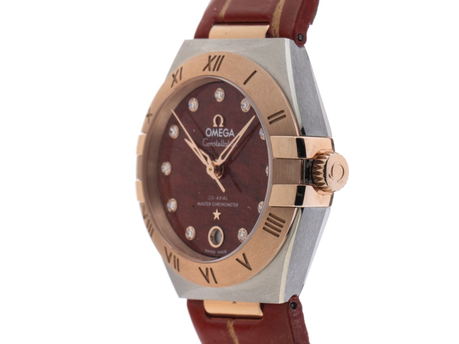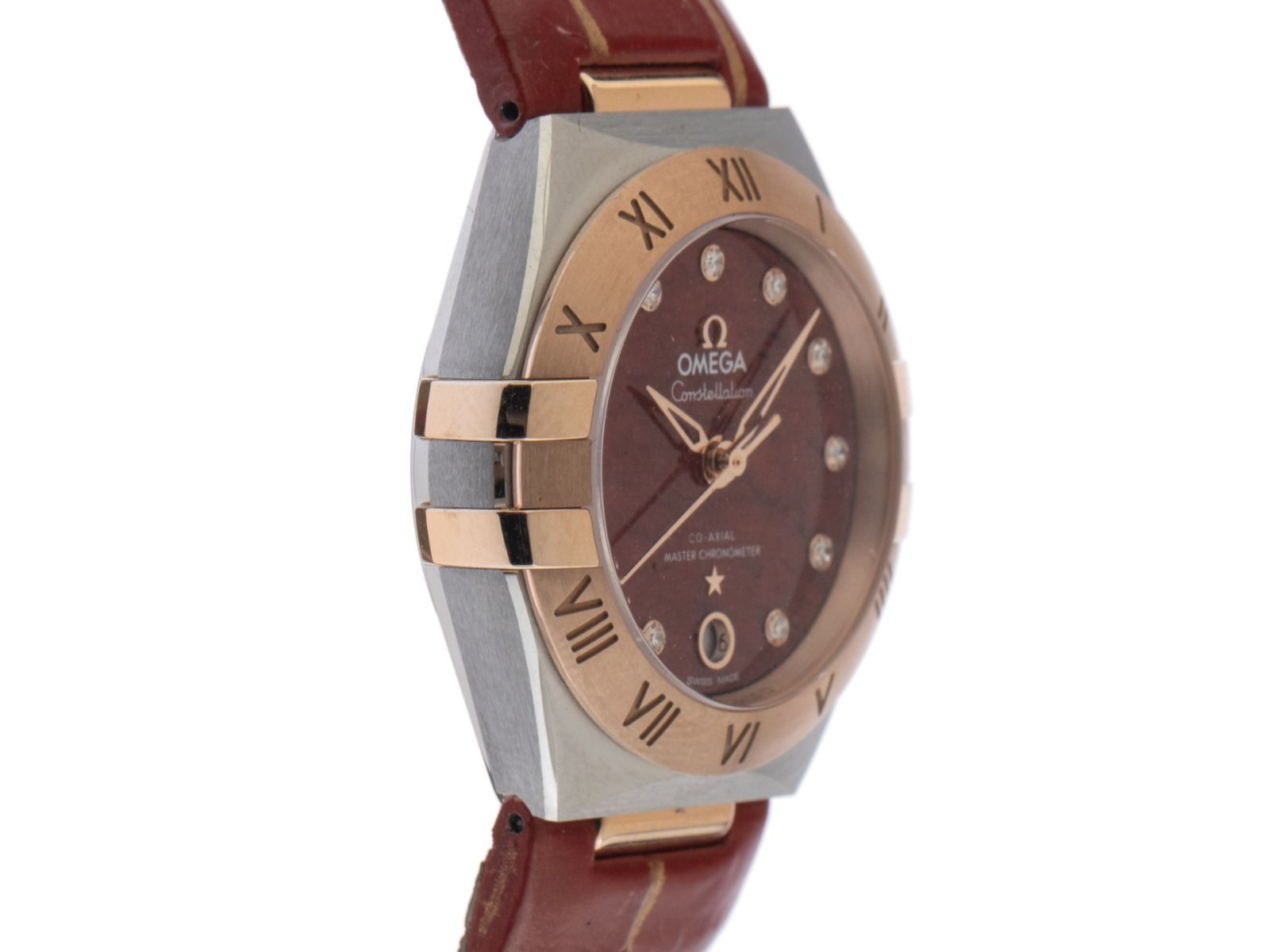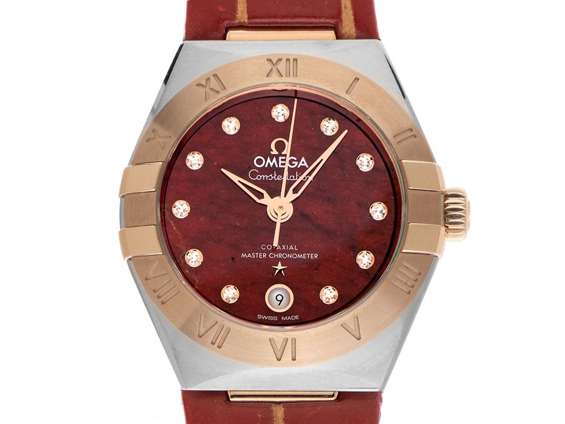 Omega Constellation Stahl Roségold Diamanten Quarz Armband LederGehäuse Edelstahl / 18kt Roségold poliert und satiniert, Gehäusedurchmesser ohne Krone 29mm, Gehäusehöhe 12,2mm. Lünette 18kt Roségold poliert und satiniert mit gravierter römischer 12-Stunden Skala. Armband Leder rot, Anstoßbreite 18mm, Stiftschließe Edelstahl Edelstahl mit Hersteller-Logo. Zifferblatt aus natürlichem rotem Aventurin mit 11 aufgesetzten Diamantindexen und 18kt Sedna™-Goldenen Zeigern. Uhrwerk Automatik, Omega Manufakturkaliber 8700 mit 28 Edelsteinen. Anzeige von Stunde, Minute und Sekunde über Zeiger aus der Mitte mit Sekundenstopp zur sekundengenauen Einstellung der Uhrzeit, Datumsanzeige mit Schnellverstellung bei 6 Uhr. Saphirglas kratzfest, gewölbt und entspiegelt. Krone mit Hersteller-Logo. Boden Edelstahl verschraubt und graviert mit Saphirglas Sichtfenster. Gewicht der Uhr inklusive Armband 46g. Wasserdicht bis 5 ATM. Referenznummer: 131.23.29.20.99.001, Gehäusenummer: 83029XXX, ID: ST3657126001223H-12900, Artikelnummer: 10000072738. Original Omega Box mit Umkarton und Garantie Papiere von September 2022 sowie Diamant Zertifikat und Beschreibung, Full Set. Ungetragen. Lieferzeit sofort.