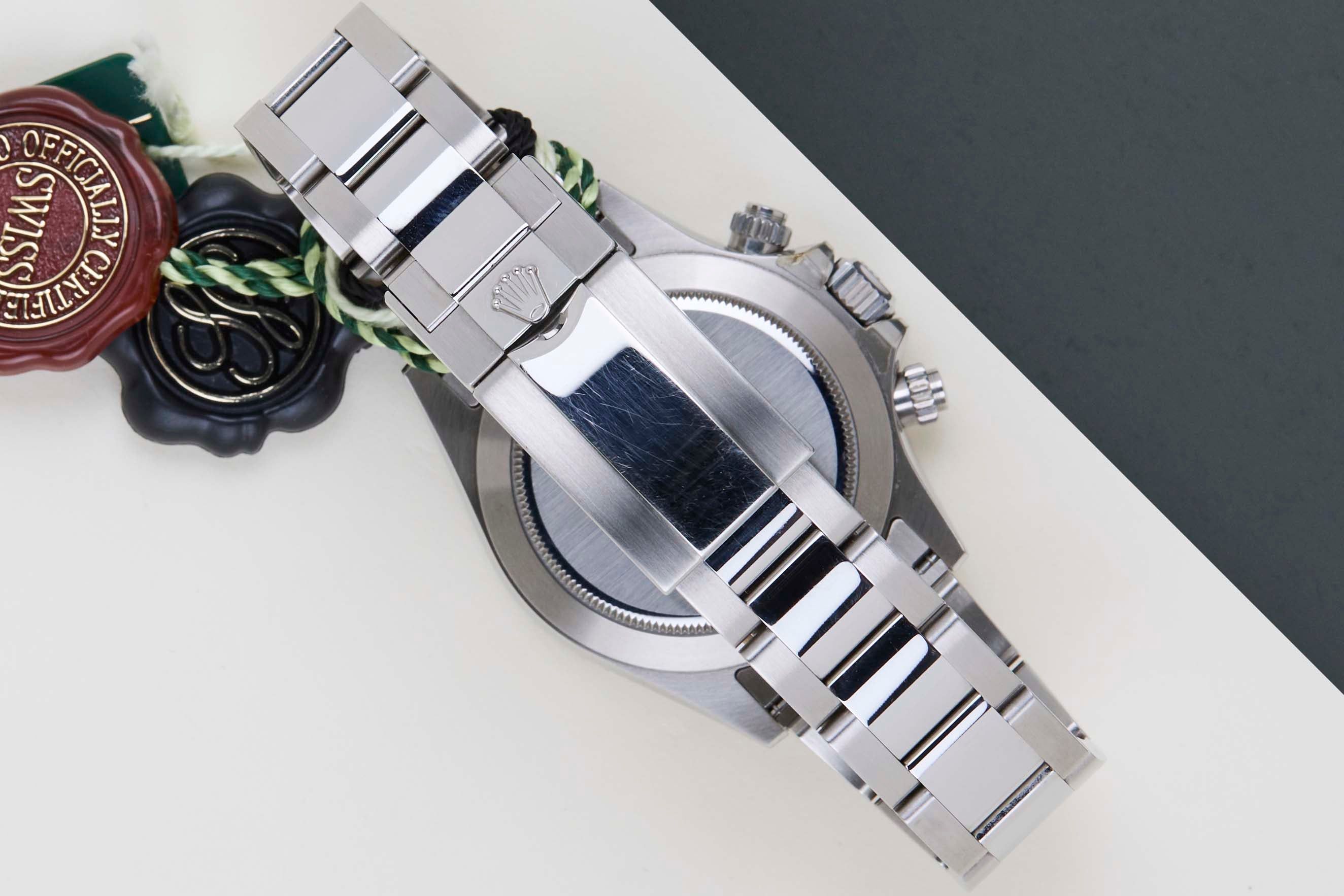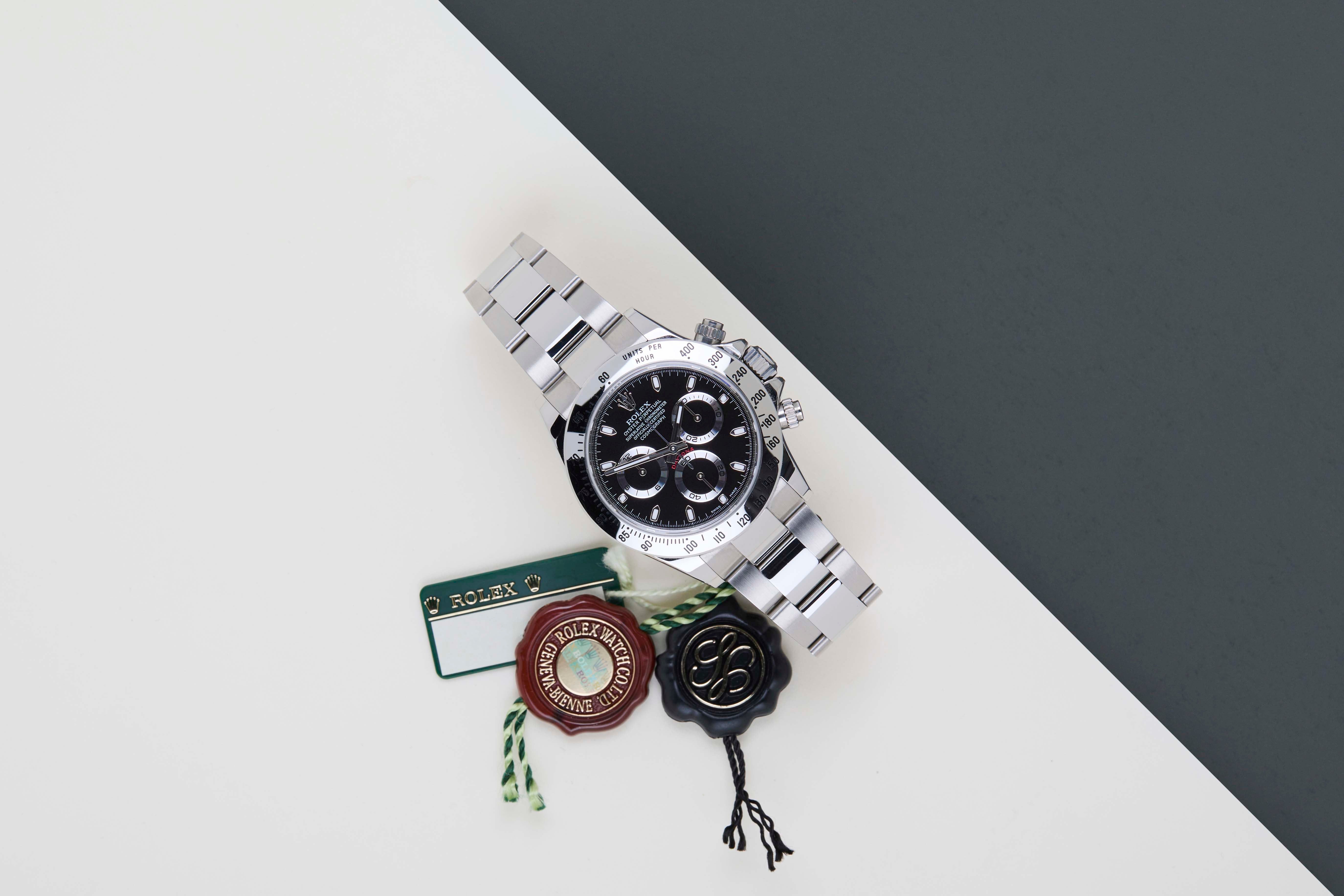 Full Set | European Rolex Warranty Card (LC100 - Germany) | Including Original Receipt | Unpolished Condition The reference 116520 is the first generation of the Daytona with an in-house movement by Rolex, Calibre 4130. The new calibre was the result of five years of innovation, refinement, and technical improvement resulting in a better and more reliable calibre.This Rolex Daytona has been sold for the first time in July 2014. It is fitted with a 'Chromalight' Dial. The Chromalight can be recognised by the lume, which lights up blue.This Rolex Daytona 116520 is in Mint condition and comes with the original Rolex Warranty Card, original box and original Invoice. Furthermore, the watch has been serviced by our watchmakers and therefore comes with one year of Steiner warranty.