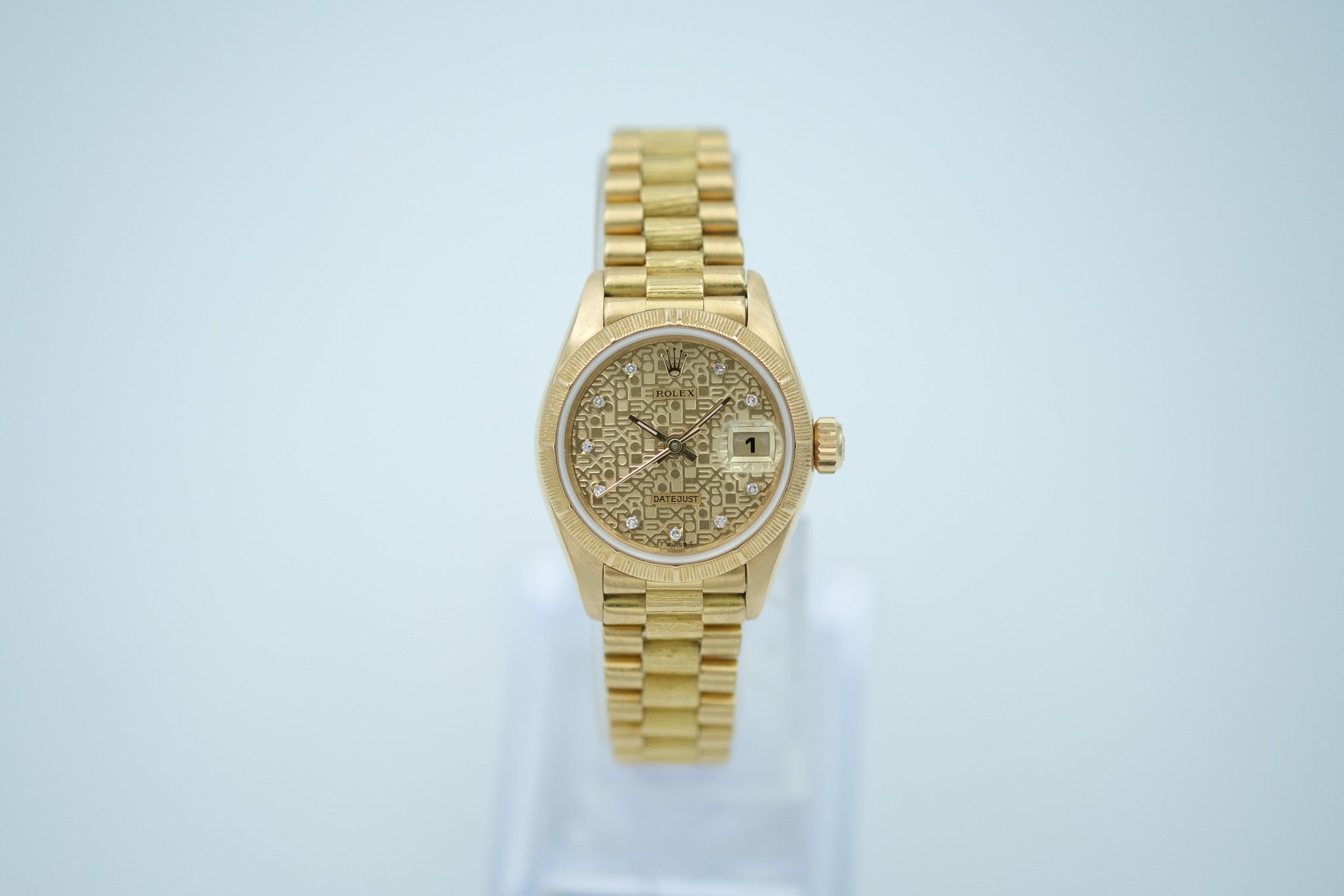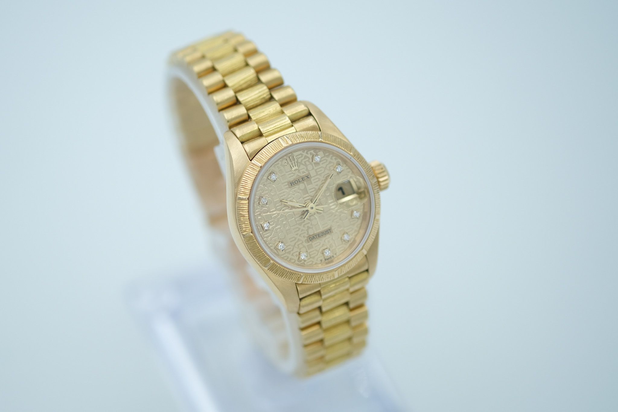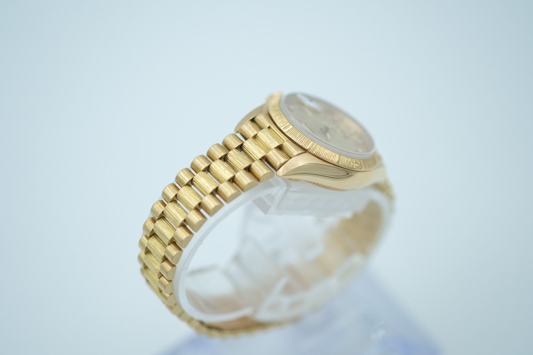 A luxurious jewel on your wrist – this Lady-Datejust with reference 69278 combines classic Rolex elegance with opulent design features that immediately set it apart from the crowd. Particularly striking are the bark engravings on the bezel and President bracelet, a rare, artfully textured finish that gives the watch an extraordinary aura.The 26 mm 18-karat yellow gold case is in very good condition with only a few normal signs of wear. The lugs are strong and clearly contoured, which speaks for the excellent condition of the case.
