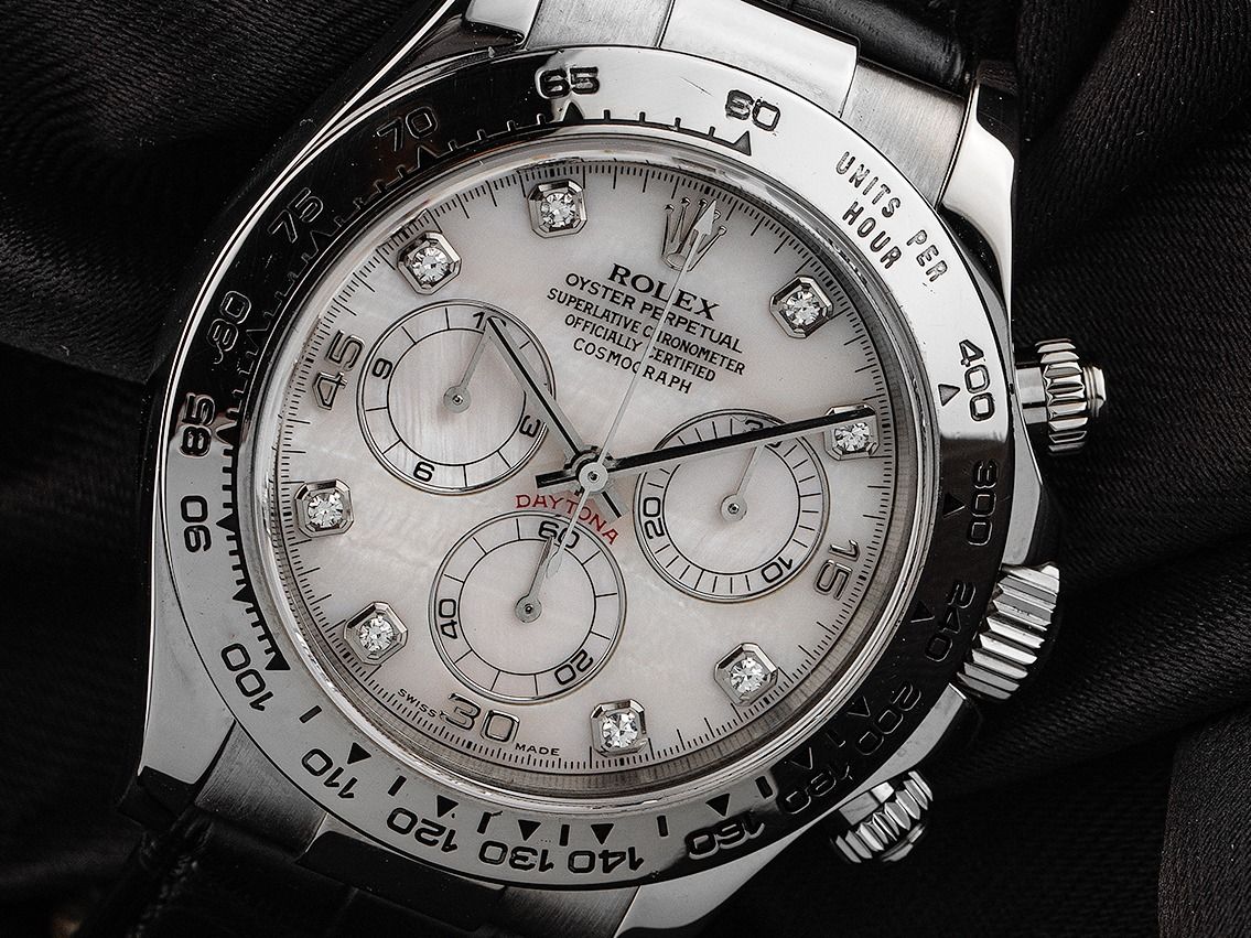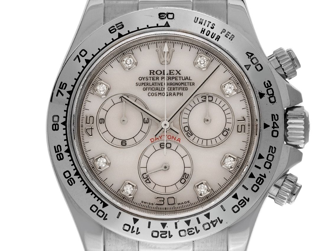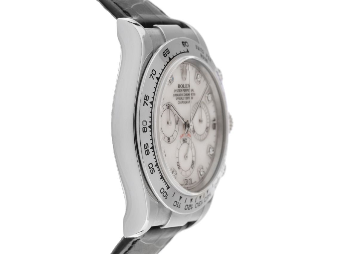 Rolex Daytona 18kt Or blanc Diamants Nacre Automatique Chronographe Bracelet Cuir Boucle déployante
