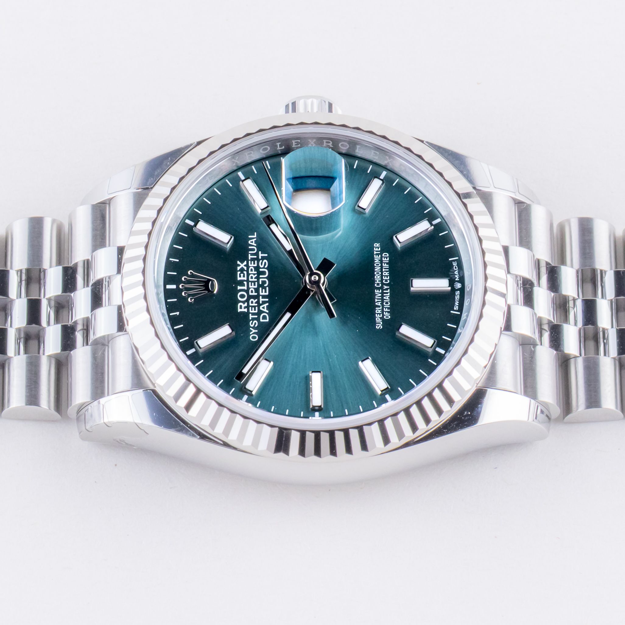 Rolex Oyster Perpetual Datejust reference 126234 from 2025 including full set. The Datejust 126234 measures a 36mm stainless steel case, a stainless steel Jubilee bracelet with Oysterclasp and a 18k white gold fluted bezel. This Datejust 126234 features an automatic movement caliber 3235 with quickset date function, scratch resistance sapphire crystal and a mint green dial with chromalight hands and markers.