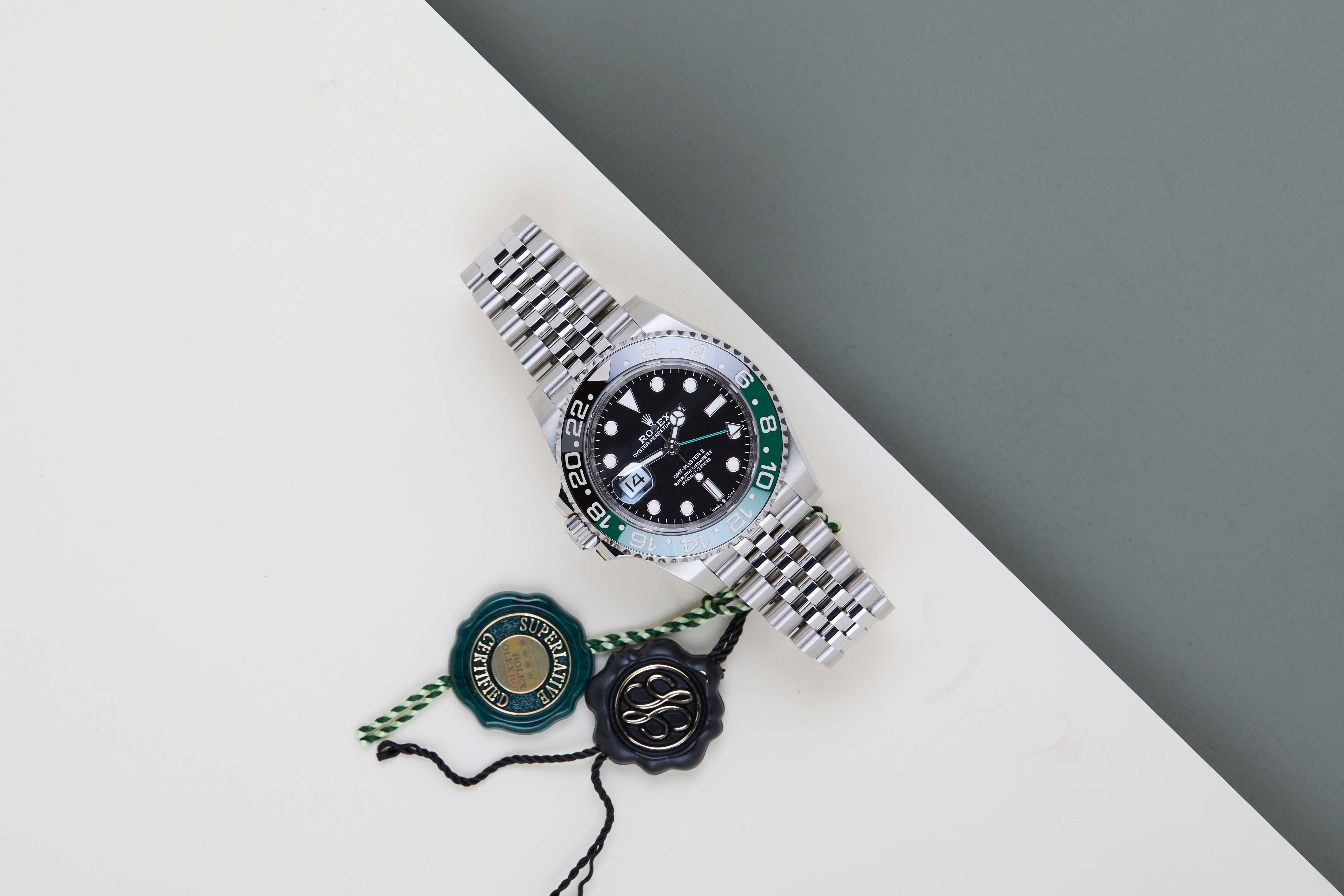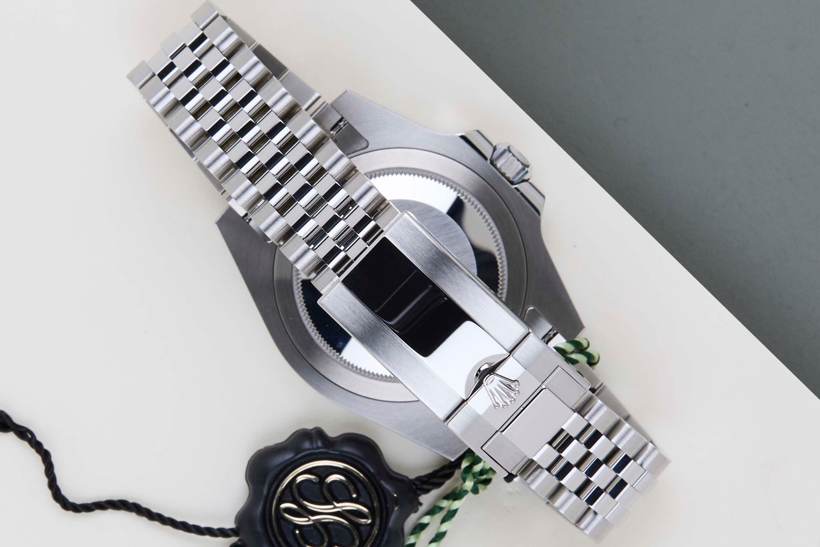 New & Unworn | Full Set | International Rolex Warranty Until December 2030 The Rolex GMT was originally designed in collaboration with Pan American Airways and issued to their crews on long-haul flights. The dual time zone can track local and home time, which is a useful tool for pilots and those who are traveling a lot across different time zones.The reference 126720 is the second generation of the GMT-Master II with a Ceramic Bezel. The material to make this bezel is called 'Cerachrom', which was developed completely in-house by Rolex to be highly scratch-resistant.This GMT is equipped with the Black and Green Bezel, which can be derived from the reference 126720VTNR, Lunette Vert Noir. This GMT-Master is made of stainless steel and is fitted with a Jubilee Bracelet, which is equipped with the Easylink. This extension, allows the wearer to either extend or shorten the bracelet by 5 millimeters, improving the wearability and usability of the watch.This Rolex GMT-Master II is in New & Unworn condition and comes with the original Rolex Warranty Card and Box. Furthermore, the watch has International Rolex Warranty Until December 2030.