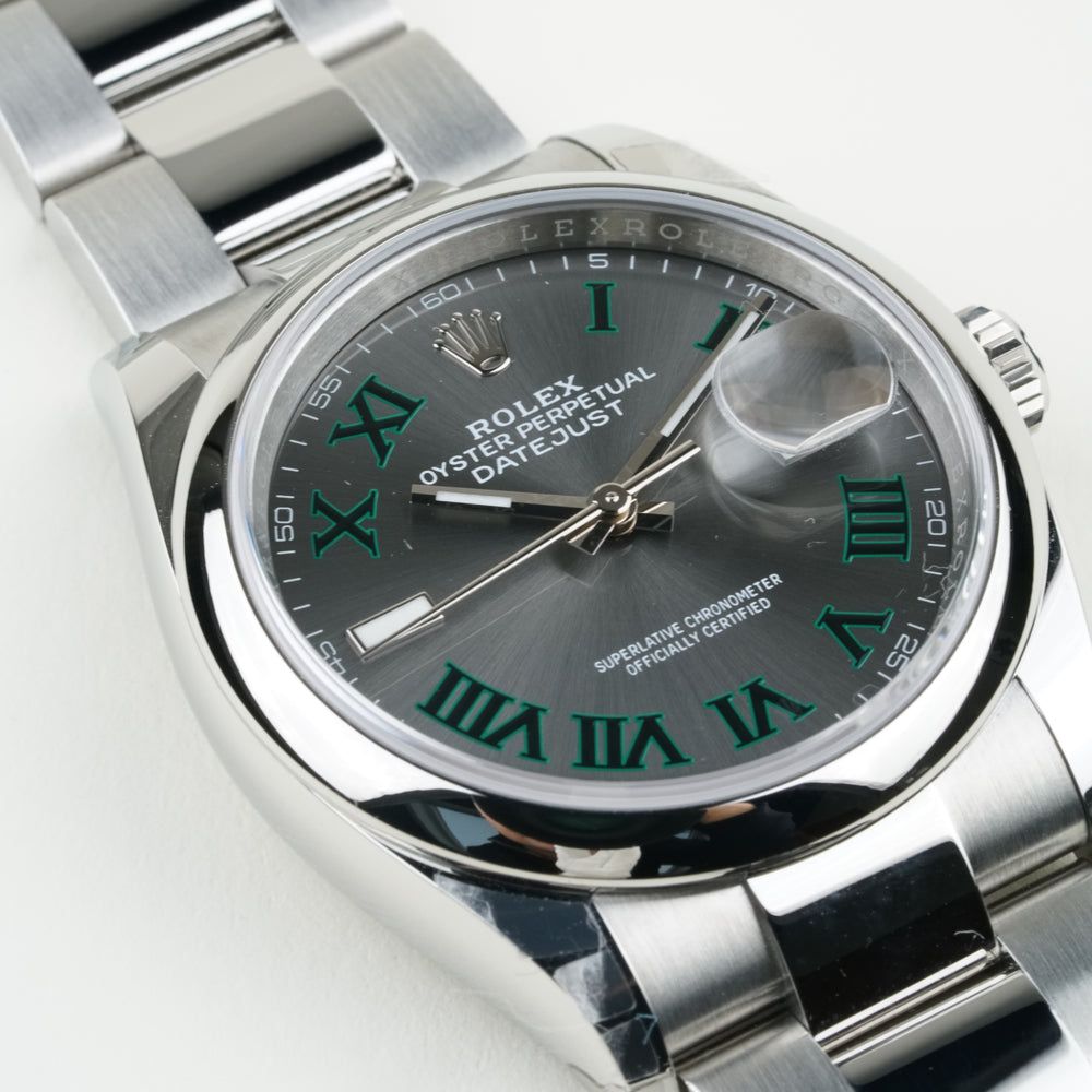 The Rolex Datejust 36mm Ref. 126200 embodies timeless elegance and everyday versatility. Crafted in robust stainless steel, it combines a sleek Oyster case, smooth domed bezel, and matching Oyster bracelet. The iconic Wimbledon dial gives this model its character. The rhodium grey sunburst finish catches the light beautifully, while the green Roman numerals and black chapter ring add depth and contrast that instantly stand out. Inside beats the automatic Caliber 3235. This watch is new and unworn, delivered as a full set with its original box, papers, and Rolex warranty card. A sought-after configuration that perfectly blends sporty charm with understated luxury.