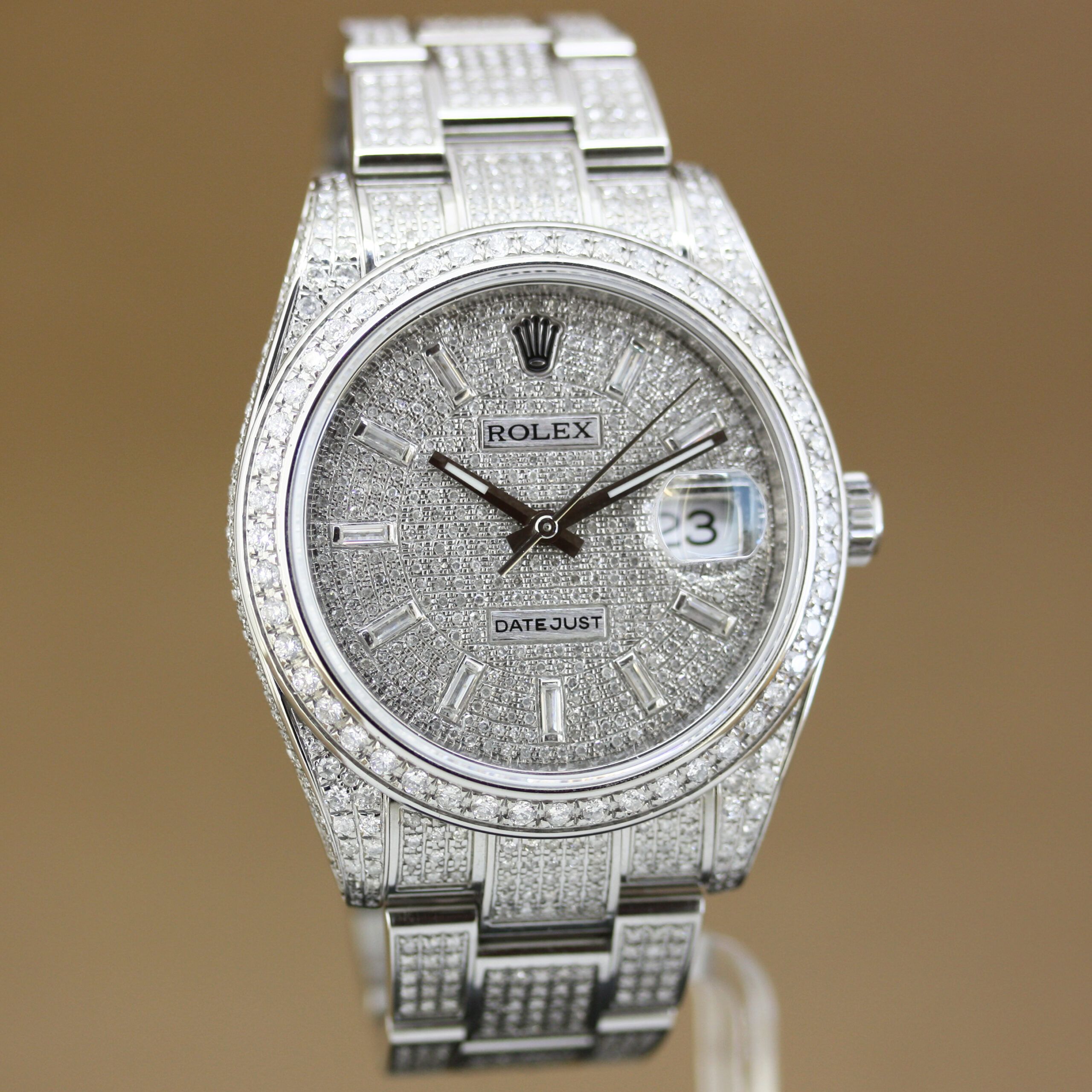 Cette montre est basée sur une Rolex Datejust 41 en acier inoxydable d'origine et a été entièrement sertie de diamants naturels (après-vente).