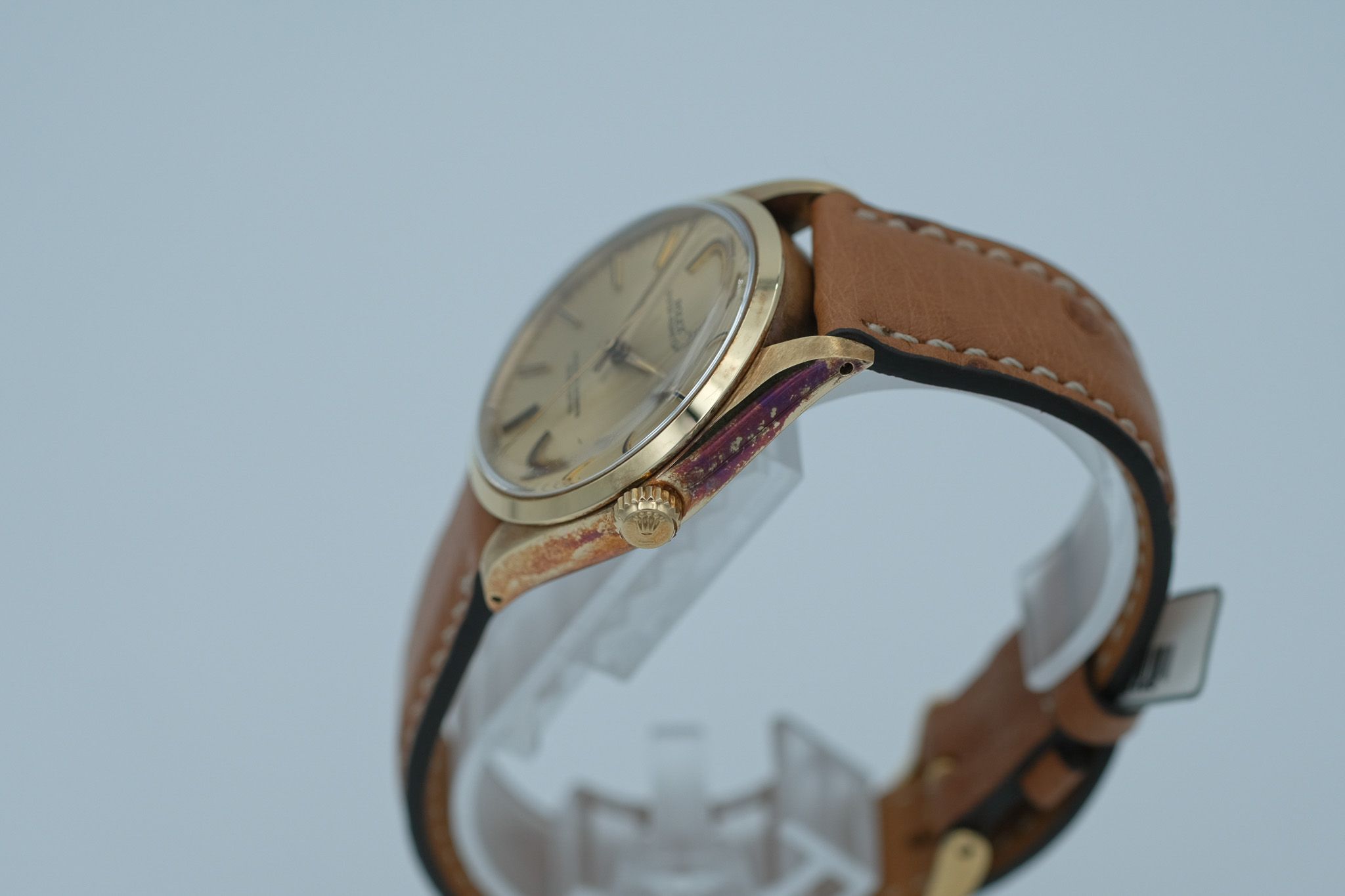 Comme la montre n'a pas été portée ces dernières années, les flancs du boîtier ont développé une belle oxydation naturelle, donnant à l'or une patine chaude et honnête qui renforce fortement son caractère vintage.