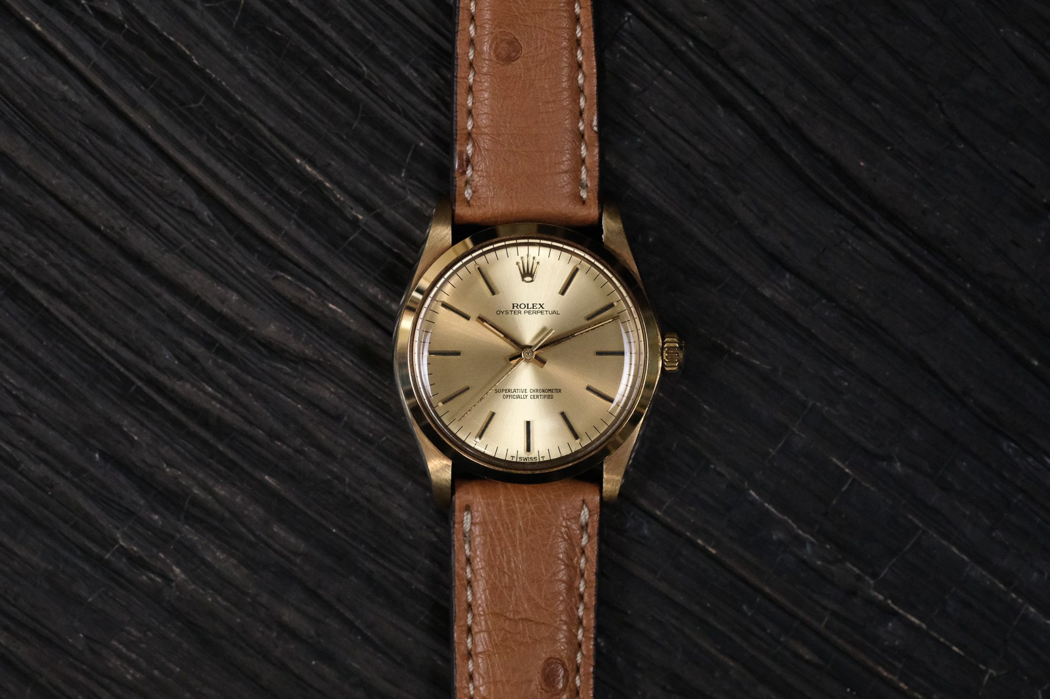 The Oyster Perpetual Reference 1002 stands for timeless elegance, a focus on the essentials, and uncompromising quality. Crafted in 14-karat yellow gold, this model impresses with its clean design language and an aura that is rarely found today in such original condition.The case of this example is in exceptional overall condition and appears to have never been polished. The lugs are thick and well defined, all chamfers are crisp and clearly visible, and the original waterfall brushing on the top of the lugs is still fully intact.