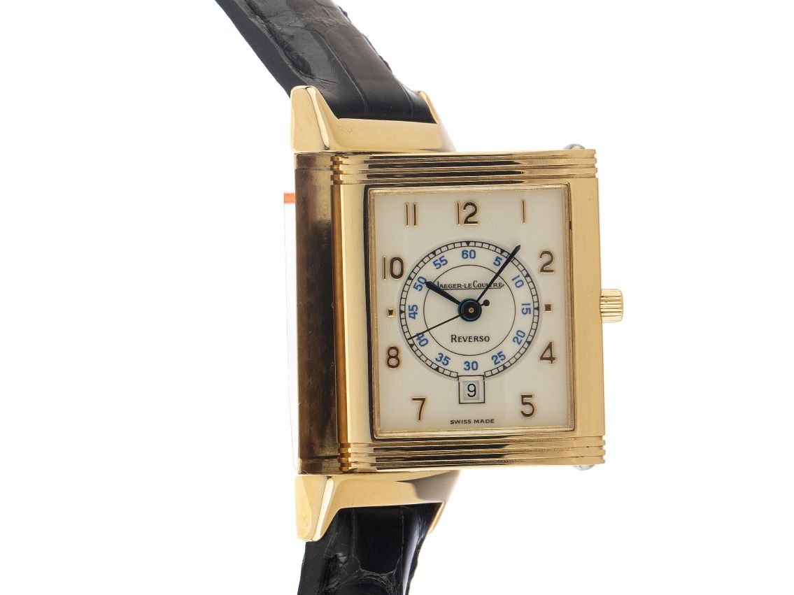 Jaeger-leCoultre Reverso Classic Monoface 18kt Gelbgold Quarz Armband LederGehäuse 18kt Gelbgold poliert, rechteckig, Gehäusemaße ohne Krone (L x B x H) 39 x 23 x 6,9mm, patentiertes 180° Wendegehäuse. Armband Krokoleder schwarz mit Ziernaht, Anstoßbreite 17mm, Stiftschließe Gelbgold vergoldet. Zifferblatt cremefarben mit aufgesetzten gelbgoldenen arabischen Ziffern und Punktindexen sowie gebläuten Zeigern. Uhrwerk quarzgesteuert, Jaeger-leCoultre Kaliber 611 mit 8 Edelsteinen. Anzeige von Stunde, Minute und Sekunde über Zeiger aus der Mitte mit Sekundenstopp zur sekundengenauen Einstellung der Uhrzeit, Datumsanzeige mit Schnellverstellung bei 6 Uhr. Saphirglas kratzfest. Krone geriffelt mit Hersteller-Logo. Boden 18kt Gelbgold graviert. Gewicht der Uhr inklusive Armband 43g. Referenznummer: 250.5.11, Gehäusenummer: 1663XXX, Baujahr: 1976, ID: P209170001225H-7600, Artikelnummer: 10000083766. Mit Gangkontrolle, neuer Batterie und äußerlicher Aufarbeitung von Dezember 2025. Original Jaeger-leCoultre Box mit Umkarton sowie Watchregister Auszug von Dezember 2025, The Watch Register Zertifikat / ohne Eintrag (Internationale Datenbank für verlorene oder gestohlene Uhren). Superschnäppchen, Kapitalanlage mit Wertsteigerungspotential, extrem seltenes Sammlerstück, fast nicht getragen. Sehr guter Zustand. Lieferzeit sofort.