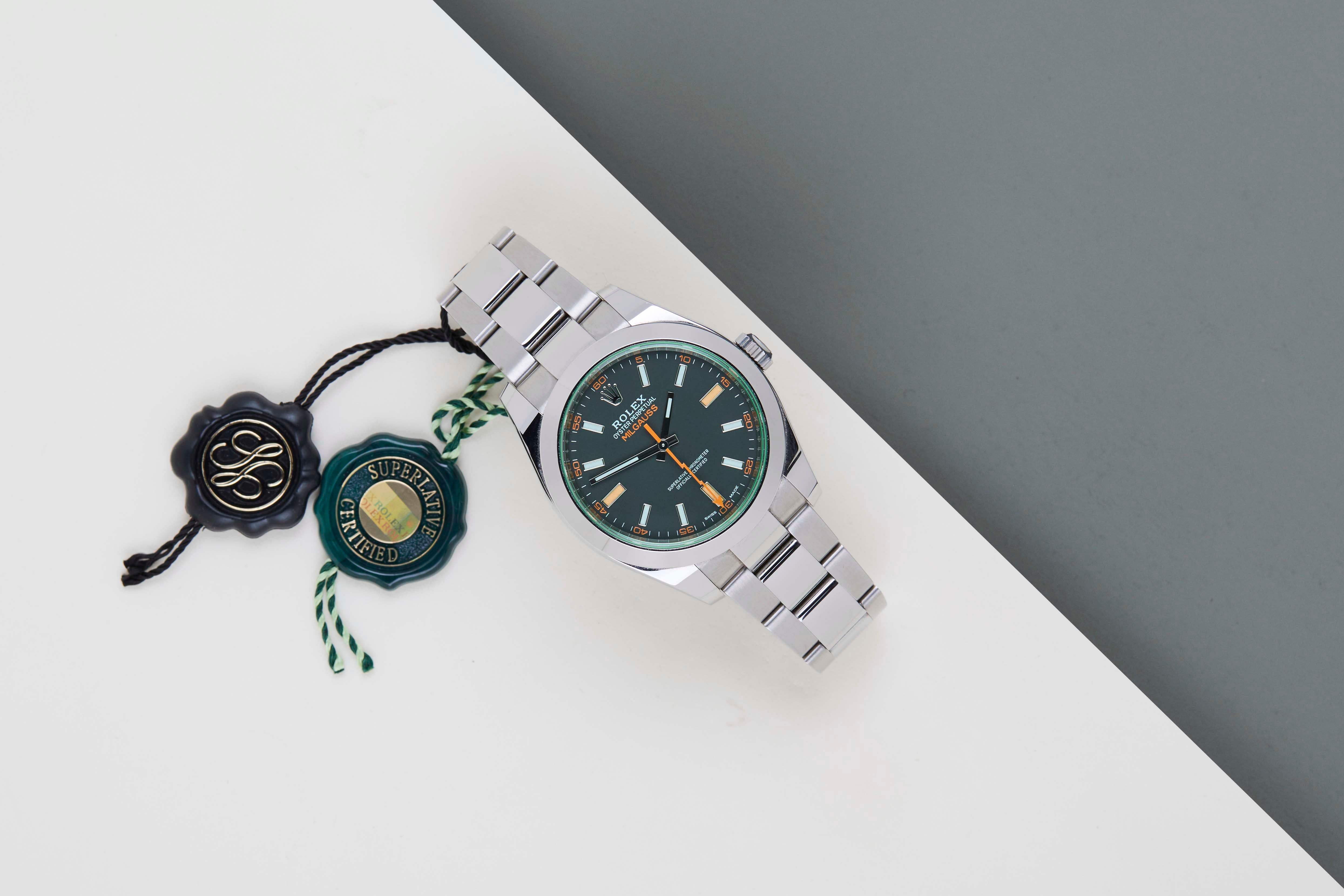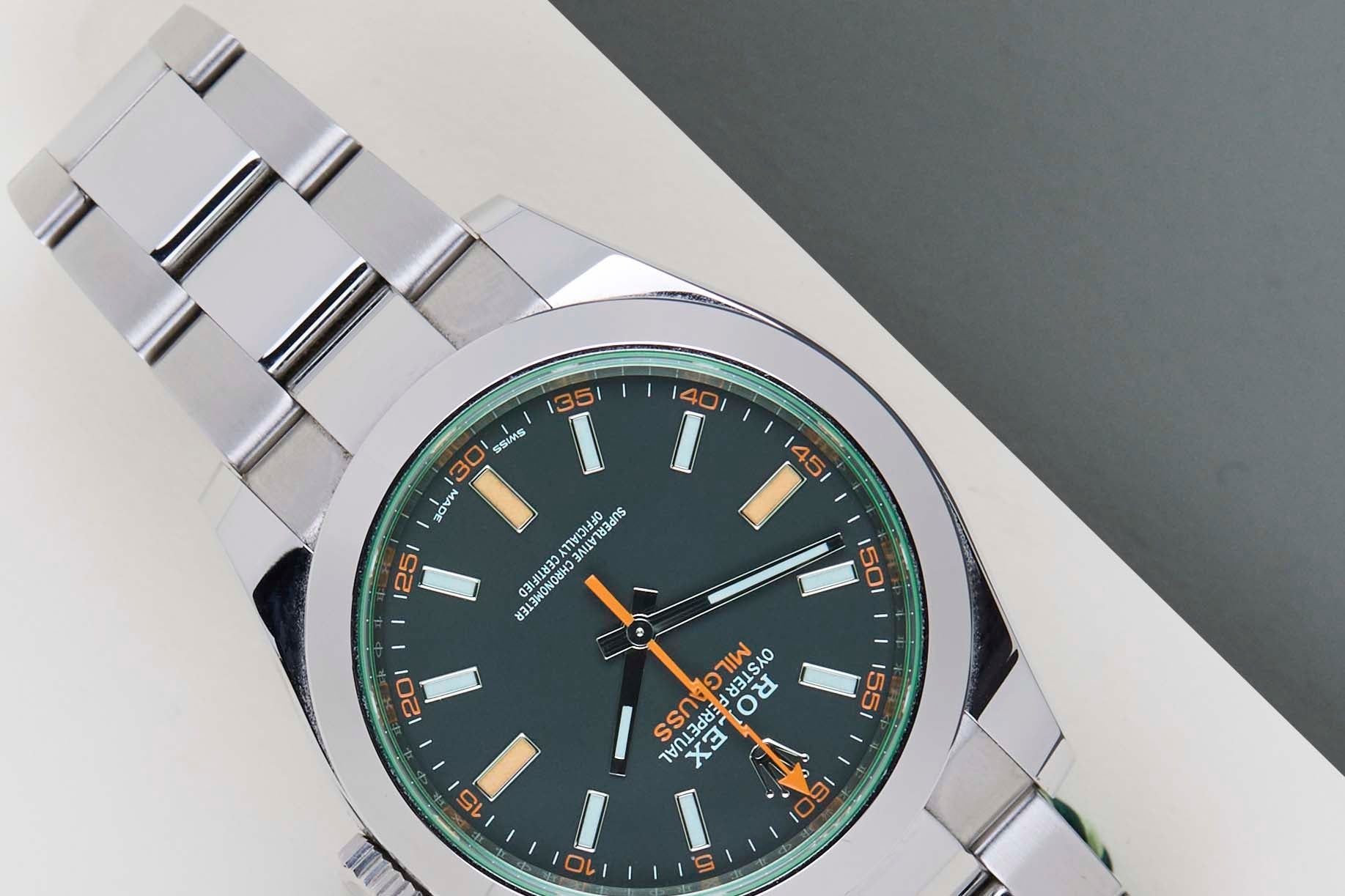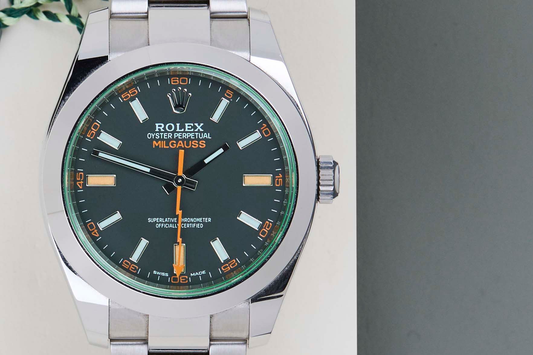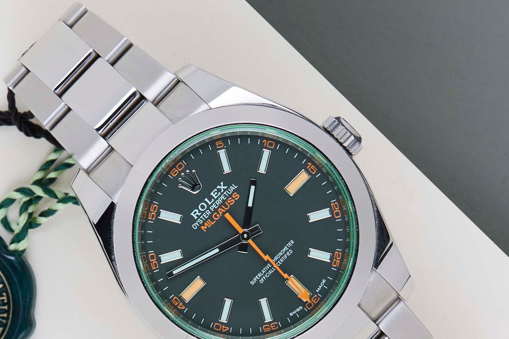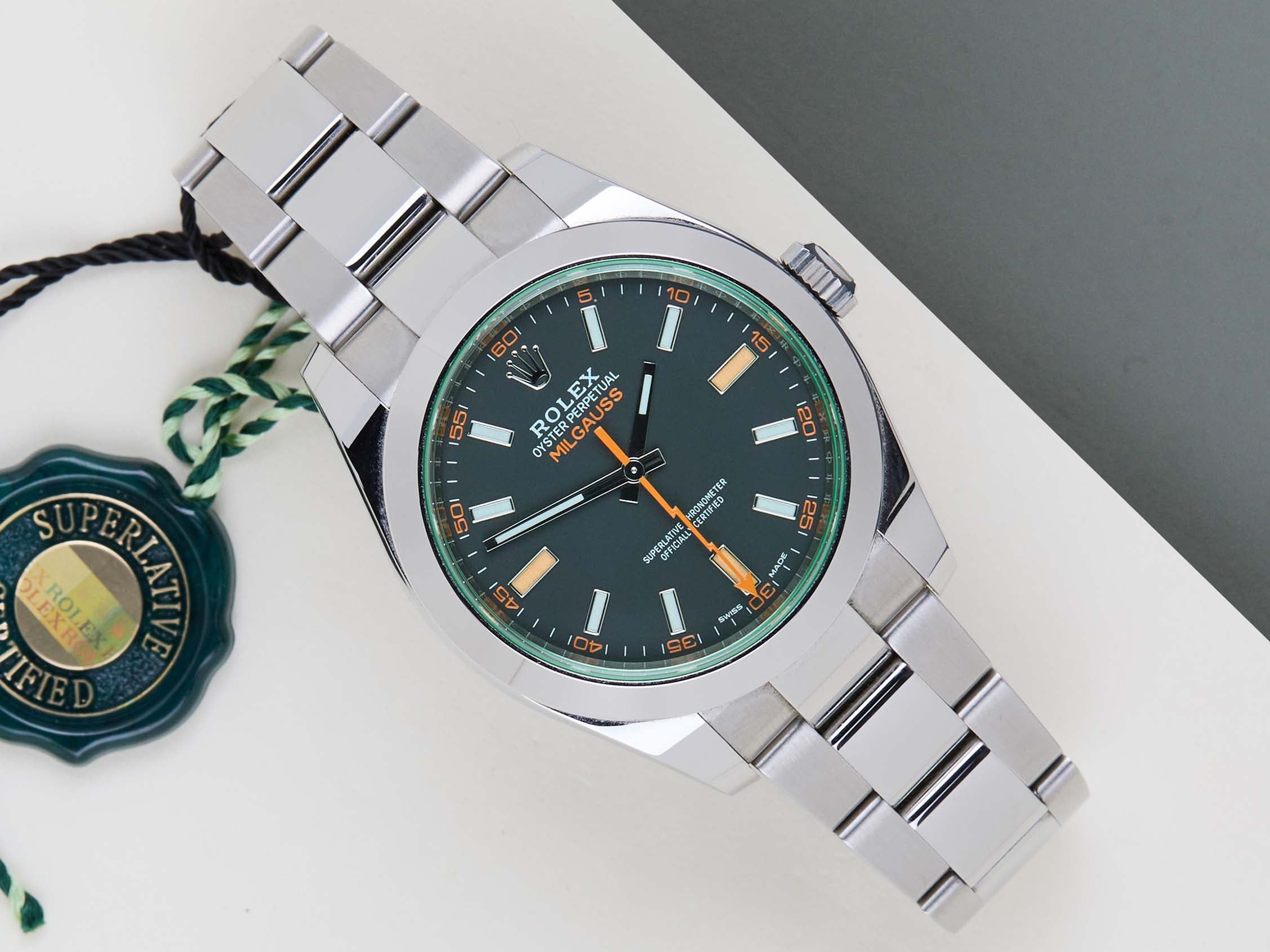 Full Set | International Rolex Warranty until September 2027 The Rolex Milgauss was originally introduced in 1956 and has undergone several updates and redesigns over the years. The Rolex Milgauss is a watch that was designed for people who work in environments where strong magnetic fields can interfere with the accuracy of a mechanical timepiece. The name "Milgauss" comes from the French word "mille," which means "thousand," and the unit of magnetic field strength, the "gauss." The watch is able to withstand magnetic fields up to 1,000 gauss, hence the name. This Rolex Milgauss 'Black Dial' was sold for the first time in September 2022.The Rolex Milgauss reference 116400 is a version of the watch that was introduced in 2007. The 116400GV also features a green sapphire crystal, which is a signature feature of this generation of the Milgauss.This Rolex Milgauss is in Mint condition and comes with the original Rolex Warranty Card and box. Furthermore, the watch still has International Rolex Warranty until September 2027.
