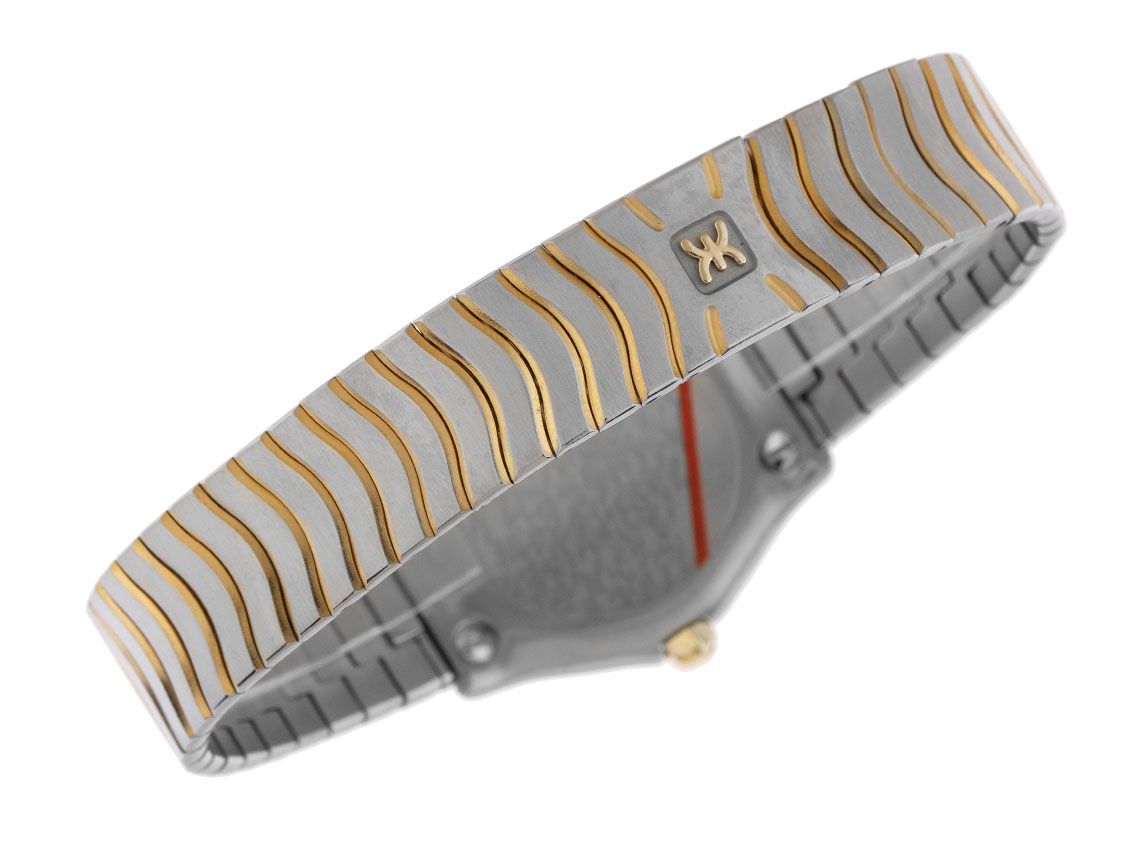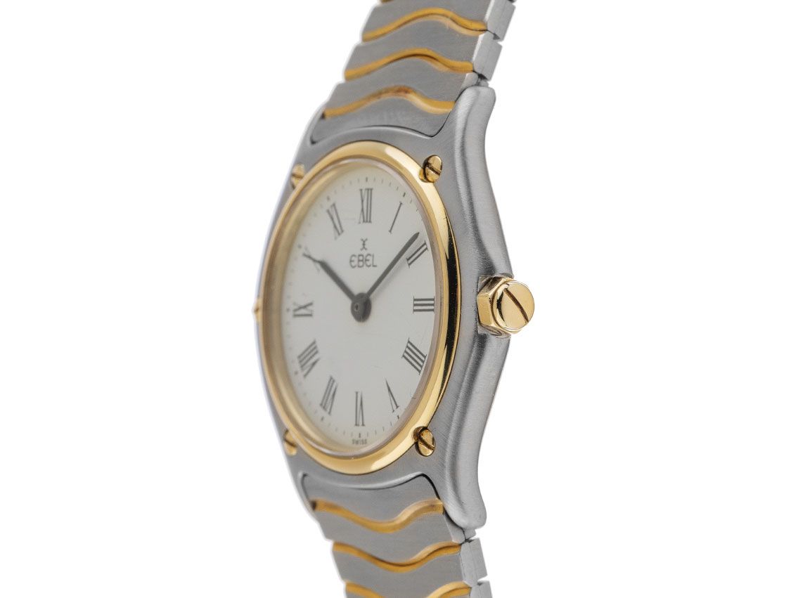 Ebel Sportwave Stahl 18kt Gelbgold Quarz Armband Stahl 18kt GelbgoldGehäuse Edelstahl satiniert, Gehäusedurchmesser ohne Krone 27mm, Gehäusehöhe 5,1mm. Lünette 18kt Gelbgold glatt und poliert, 5-fach verschraubt. Armband Edelstahl / 18kt Gelbgold satiniert, Faltschließe mit Hersteller-Logo. Zifferblatt weiß mit schwarzen römischen Ziffern und schwarzen Zeigern. Uhrwerk quarzgesteuert, Kaliber Ebel 81 mit 9 Edelsteinen. Anzeige von Stunde und Minute über Zeiger aus der Mitte. Saphirglas kratzfest. Krone mit Flankenschutz. Boden Edelstahl 4-fach verschraubt und graviert. Gewicht der Uhr inklusive Armband 45g, Länge des Armbandes inklusive Gehäuse 165mm. Referenznummer: 181908, Baujahr: 1996, ID: KRE27001125RE-2290, Artikelnummer: 10000083111. Mit Gangkontrolle, neuer Batterie und kompletter äußerlicher Aufarbeitung von November 2025. Original Ebel Box. Superschnäppchen. Sehr guter Zustand. Lieferzeit sofort.