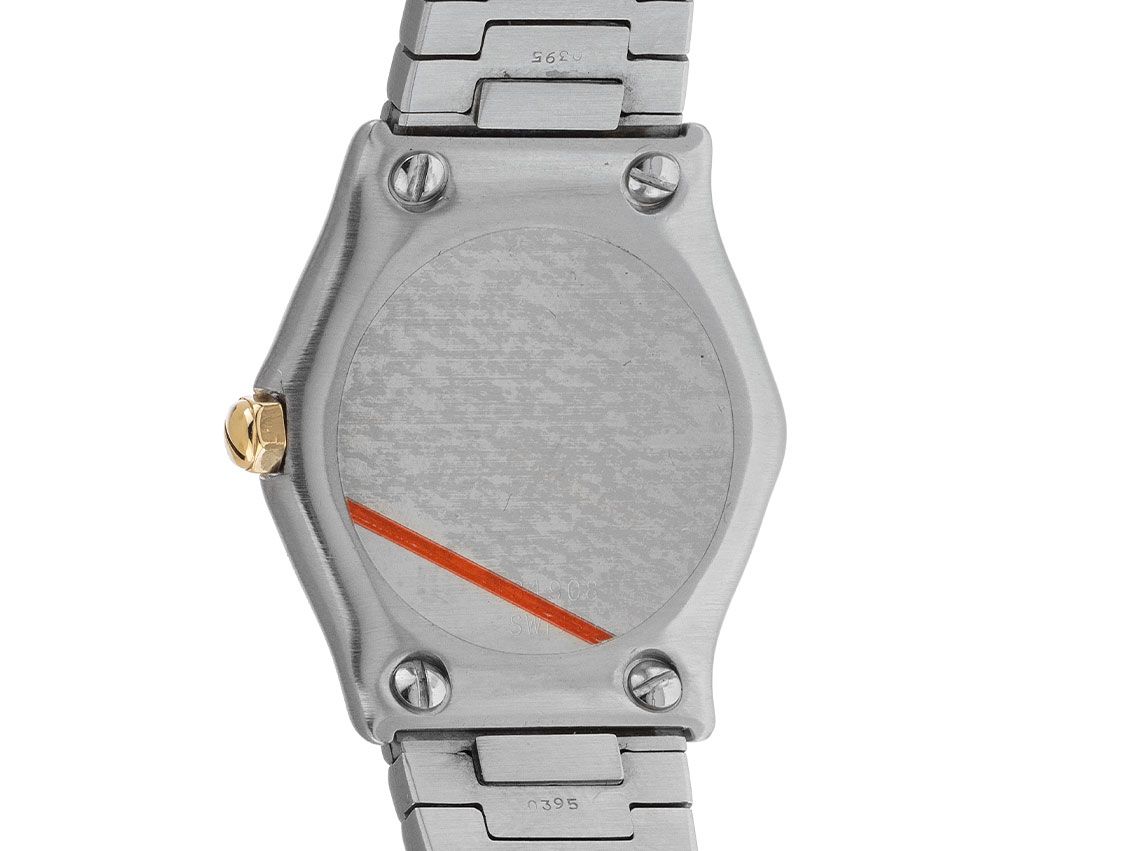 Boîtier en acier inoxydable satiné, diamètre du boîtier sans couronne 27mm, hauteur du boîtier 5,1mm. Lunette en or jaune 18kt lisse et polie, vissée 5 fois. Bracelet en acier inoxydable / or jaune 18kt satiné, fermoir déployant avec logo du fabricant. Cadran blanc avec chiffres romains noirs et aiguilles noires. Mouvement à quartz, calibre Ebel 81 avec 9 pierres précieuses. Affichage des heures et des minutes par aiguilles centrales. Verre saphir résistant aux rayures. Couronne avec protection latérale. Fond en acier inoxydable vissé 4 fois et gravé. Poids de la montre avec bracelet 45g, longueur du bracelet avec boîtier 165mm. Numéro de référence : 181908, année de fabrication : 1996, ID : KRE27001125RE-2290, numéro d'article : 10000083111. Avec contrôle du mouvement, nouvelle batterie et révision extérieure complète de novembre 2025. Boîte Ebel d'origine. Super affaire. Très bon état. Délai de livraison immédiat.