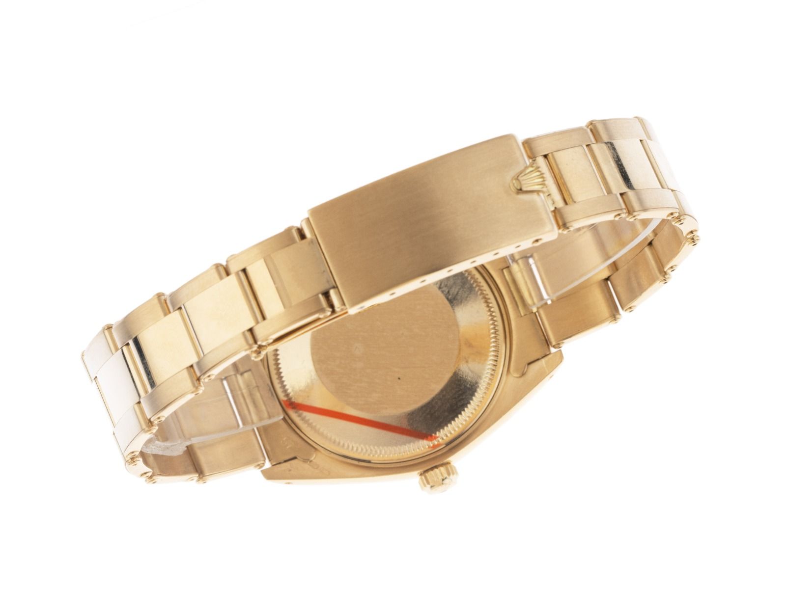 Boîtier en or jaune 18kt poli et satiné, diamètre du boîtier sans couronne 34mm, hauteur du boîtier 11,1mm. Lunette en or jaune 18kt poli et strié. Bracelet Oyster en or jaune 18kt poli et satiné, boucle déployante Rolex en or jaune 18kt avec logo du fabricant. Cadran champagne avec index en or jaune appliqués et aiguilles en or jaune. Mouvement automatique, chronomètre, calibre manufacture Rolex 1570 avec 26 pierres précieuses. Affichage des heures, minutes et secondes par aiguilles centrales, affichage de la date sous loupe à 3 heures, open 6/9 (6 et 9 ouvertes dans l'affichage de la date). Plexiglas. Couronne vissée avec logo du fabricant. Fond en or jaune 18kt vissé. Poids de la montre avec bracelet 102g, longueur du bracelet avec boîtier 190mm. Numéro de référence 1503, année de fabrication : 1980, numéro de boîtier : 6220XXX, ID : KA1760231021225H-16200, numéro d'article : 10000083893. Avec contrôle de marche et révision complète extérieure de décembre 2025. Boîte Rolex originale avec carton d'emballage et description, étui en cuir, livret de traduction, certificat de chronomètre Rolex ainsi qu'un extrait du Watch Register de décembre 2025, certificat The Watch Register / sans inscription (base de données internationale pour montres perdues ou volées). Super affaire, pièce de collection très rare. Très bon état. Délai de livraison immédiat.