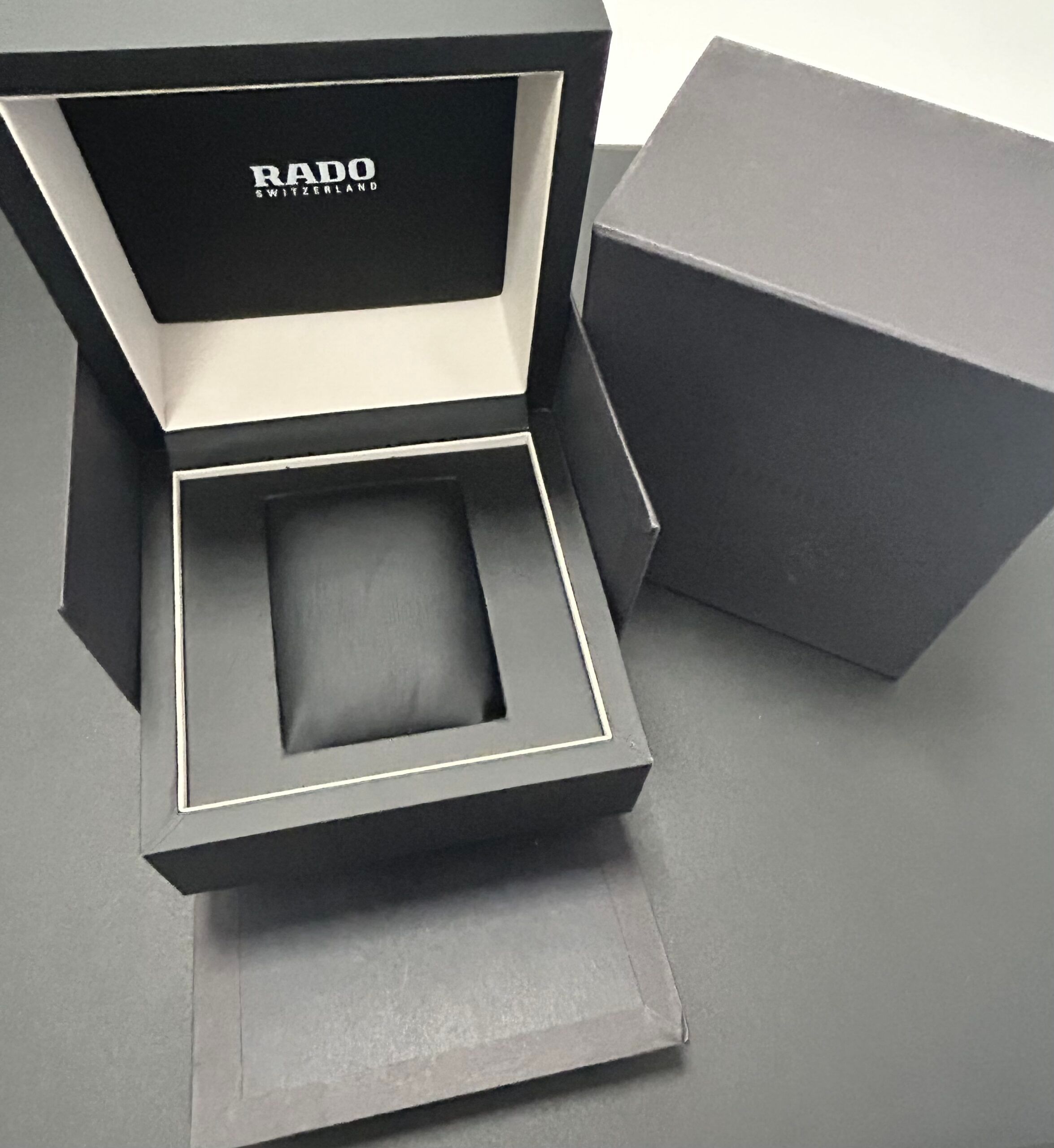 La montre est en très bon état. Avec la boîte Rado d'origine, les brochures, l'étiquette, la carte de garantie et un bracelet en cuir supplémentaire avec boucle. Ce que vous voyez sur les photos est exactement ce que vous recevrez, les images sont notre propriété.