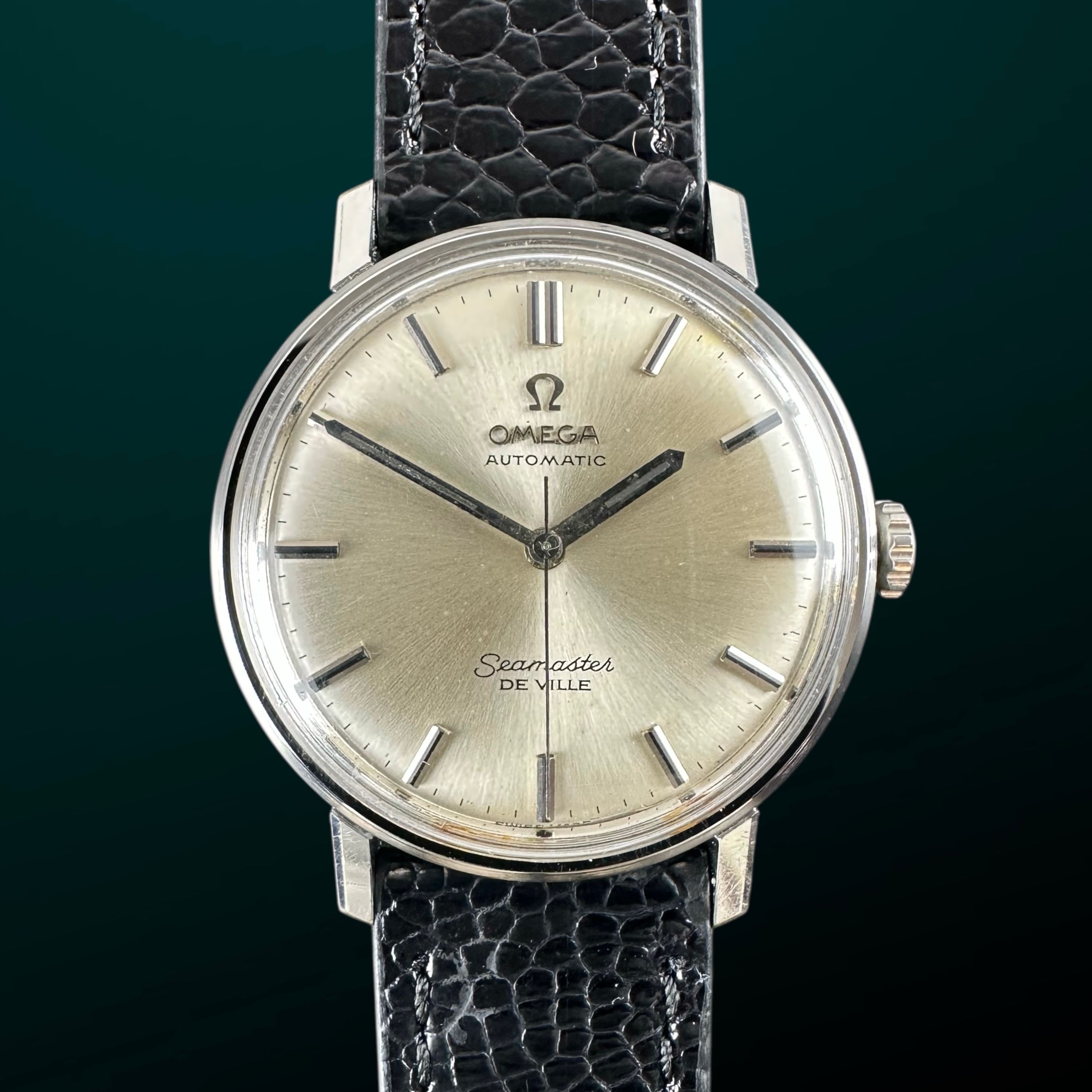 This vintage 1967 Omega Seamaster De Ville is fitted with a white sunburst dial. It features silver accents on the dial. The steel case houses the Omega Caliber 552 automatic movement, which was fully serviced in October 2025 and runs great. The plexi glass has some orange spots on the sides which are luckily barely visible when wearing the watch.It comes on a new grade 3 black calf leather strap with a light gloss and alligator grain. Overall condition is very good, with light wear and excellent vintage character.