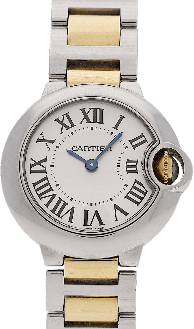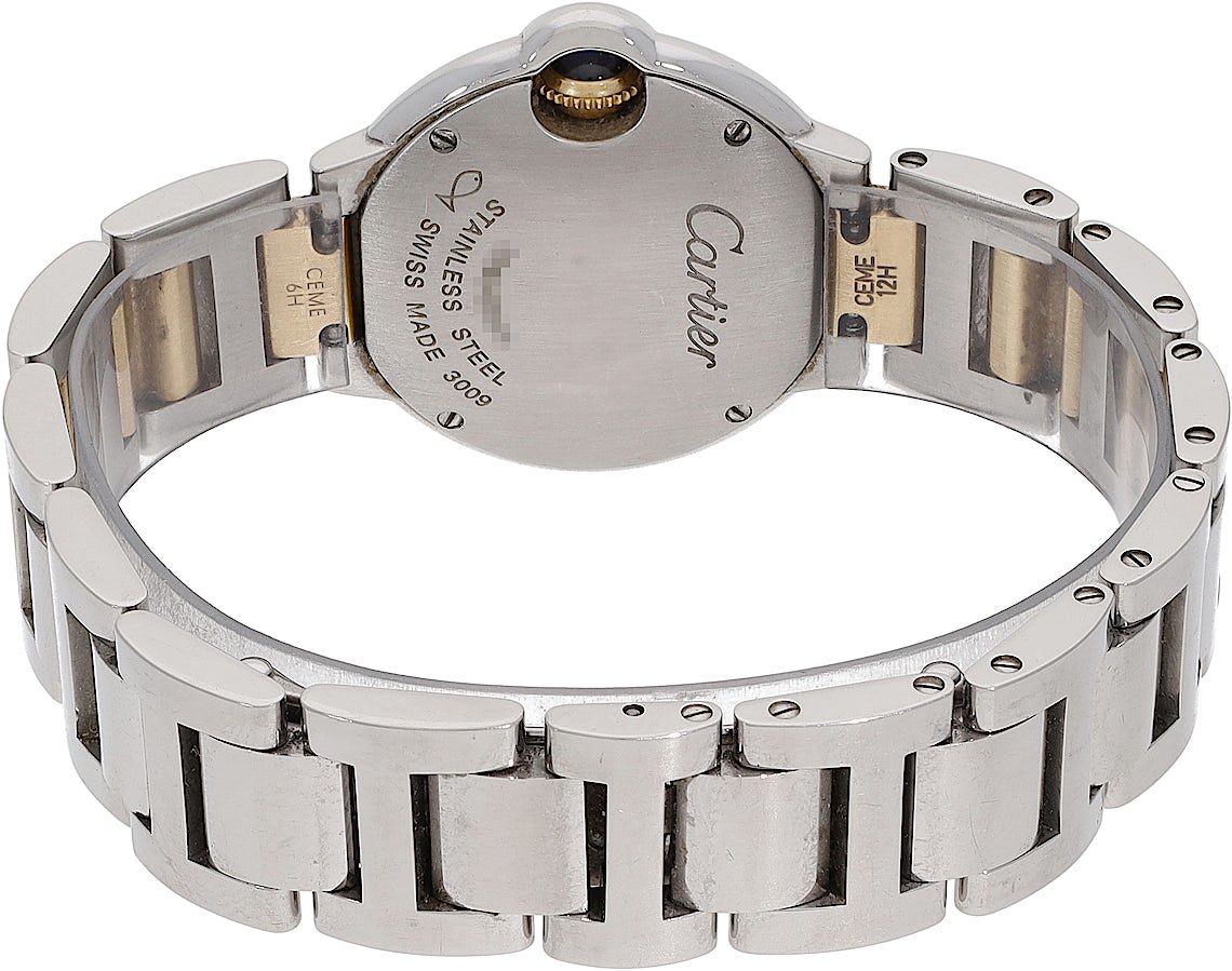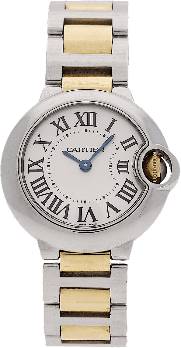 Cartier Ballon Bleu, Reference: 3009, Gender: Female, Size: 28mm, Dial color: Silver, Strap material: Stainless Steel Gold, Movement: Quartz, Condition: Previously worn with some signs of usage. The movement is flawless and the case has been cleaned. watch tested to ensure full functionality. An inspection by our certified watchmakers guarantees its authenticity., Documents: Chronext Certificate