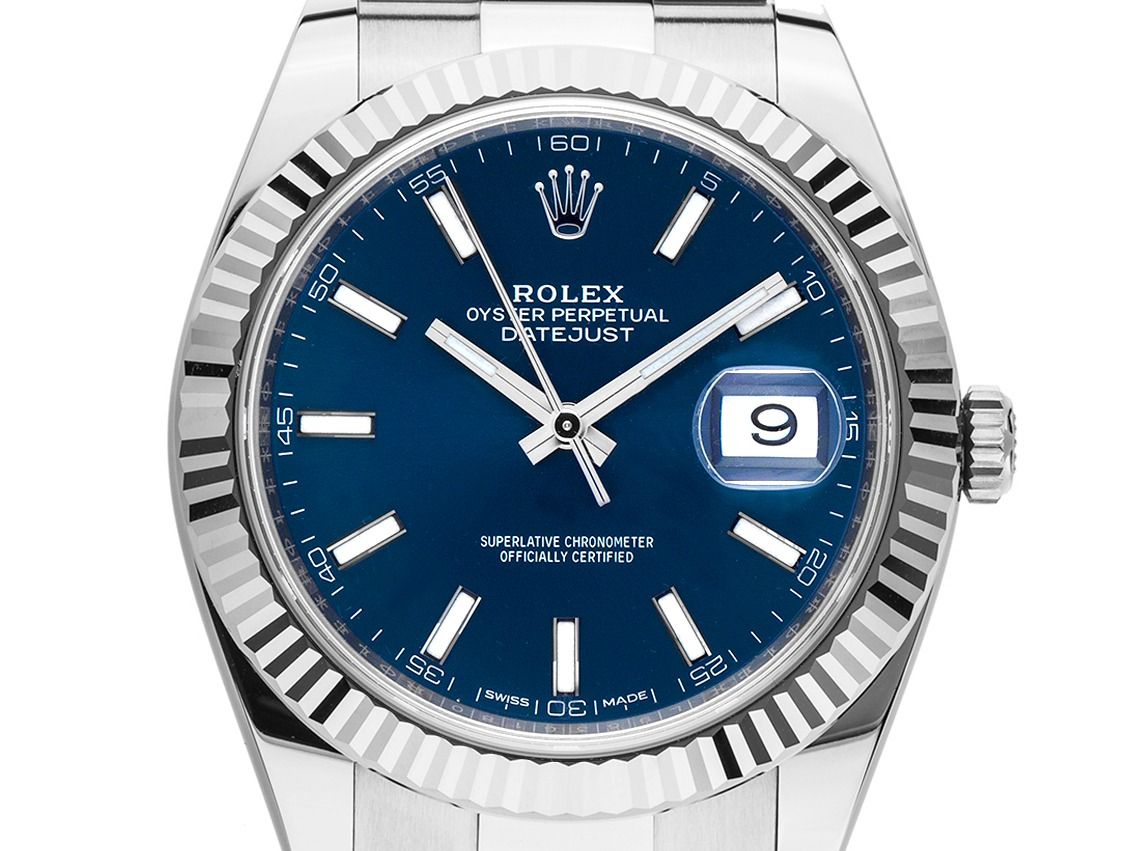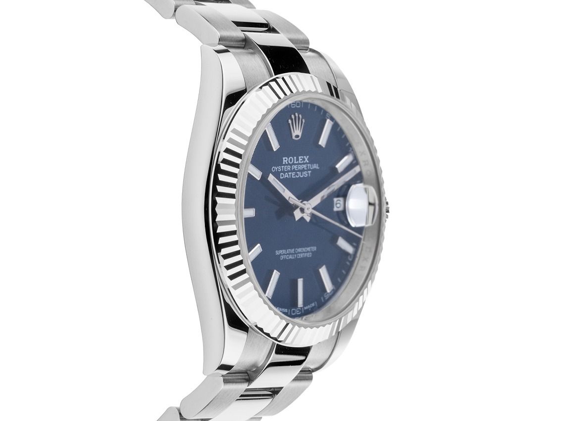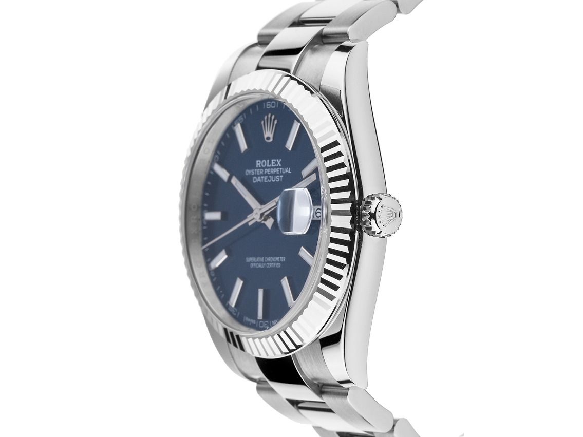 Rolex Datejust Stahl 18kt Weißgold Automatik Armband OysterGehäuse Edelstahl poliert und satiniert, Gehäusedurchmesser ohne Krone 41mm, Gehäusehöhe 11,6mm. Lünette 18kt Weißgold geriffelt und poliert. Armband Oyster Edelstahl poliert und satiniert, Rolex Faltschließe Edelstahl mit Hersteller-Logo. Zifferblatt blau mit aufgesetzten weißgoldenen Leuchtindexen und weißgoldenen Leuchtzeigern. Uhrwerk Automatik, Chronometer mit Zeugnis, Rolex Manufakturkaliber 3235 mit 31 Edelsteinen. Anzeige von Stunde, Minute und Sekunde über Zeiger aus der Mitte mit Sekundenstopp zur sekundengenauen Einstellung der Uhrzeit, Datumsanzeige mit Schnellverstellung unter Glaslupe bei 3 Uhr. Saphirglas kratzfest. Krone verschraubbar mit Hersteller-Logo. Boden Edelstahl verschraubt. Gewicht der Uhr inklusive Armband 142g, Länge des Armbandes inklusive Gehäuse 185mm. Referenznummer: 126334, Gehäusenummer: DN284XXX, ID: P2036198701225H-13800/10800, Artikelnummer: 10000083588. Mit Gangkontrolle und kompletter äußerlicher Aufarbeitung von Dezember 2025. Original Rolex Box mit Umkarton und Garantie Papiere von Oktober 2017, LC 100 / Germany EU sowie Beschreibung, Ledermäppchen, Rolex Chronometer-Siegel und Watchregister Auszug von Dezember 2025, The Watch Register Zertifikat / ohne Eintrag (Internationale Datenbank für verlorene oder gestohlene Uhren), Full Set. Kapitalanlage mit Wertsteigerungspotential. Wie Neu. Lieferzeit sofort.