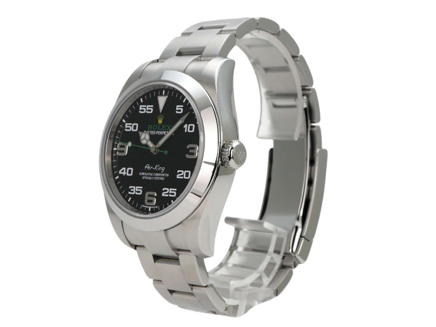 Rolex Oyster Perpetual Air-King Ref. 116900 LC100 from 2020Case made of polished and satin-finished stainless steel, case diameter 40 mm, polished stainless steel bezel, Oyster stainless steel bracelet polished and satin-finished with folding clasp, black dial with applied luminous Arabic numerals and luminous indices, automatic movement, Rolex manufacture caliber 3131 with 31 jewels, frequency 28,800 A/h, chronometer, scratch-resistant sapphire crystal, screw-down crown, green seconds hand with luminous dot, screw-down stainless steel case back, water-resistant up to 10 bar.Used watch, very good condition, complete with box and papers, German delivery from 2020.