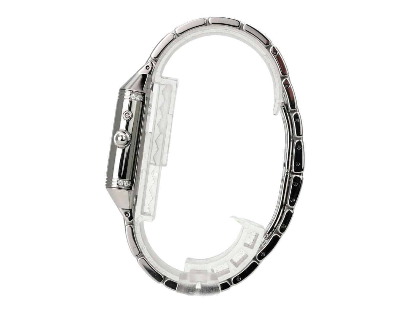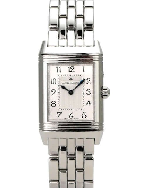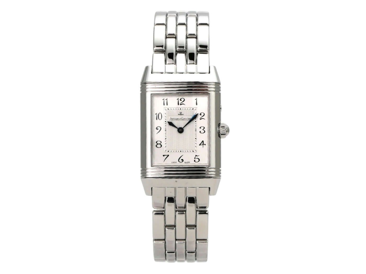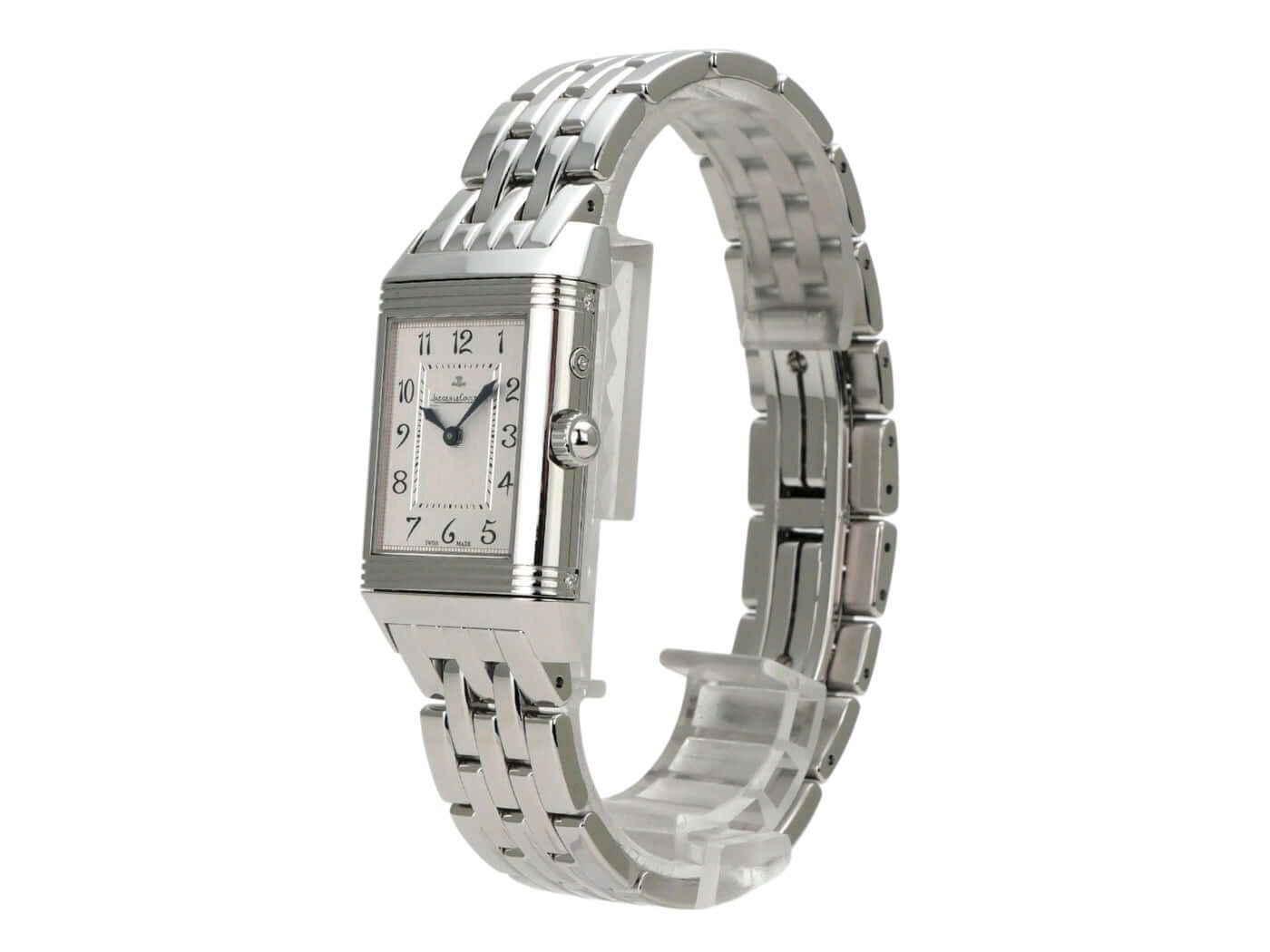 Jaeger-LeCoultre Reverso Duetto Duo 2698420Case made of polished stainless steel, case approx. 42 x 25 mm, case height approx. 9.5 mm, polished stainless steel bezel, stainless steel bracelet with folding clasp, silver-colored dial, manual winding movement, caliber Jaeger-LeCoultre 854/1, 21 jewels, 21,600 A/h, power reserve approx. 42 hours, sapphire crystal, water-resistant up to 3 bar.