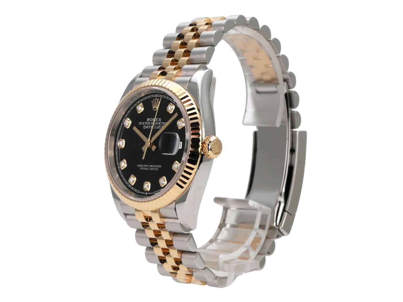 Rolex Datejust 36 Oystersteel / Yellow Gold Ref. 126233 Black Diamond Jubilee BraceletCase made of polished and satin-finished stainless steel / yellow gold, case diameter 36 mm, fluted 18 kt yellow gold bezel, Jubilee bracelet made of polished and satin-finished stainless steel / 18 kt yellow gold with folding clasp, black diamond dial, yellow gold hands, automatic movement, Rolex manufacture caliber 3235 with 31 jewels, 28,800 A/h, 70 hours power reserve, date display, chronometer, scratch-resistant sapphire crystal, screwed 18 kt yellow gold crown, screwed stainless steel case back, water-resistant up to 10 bar.