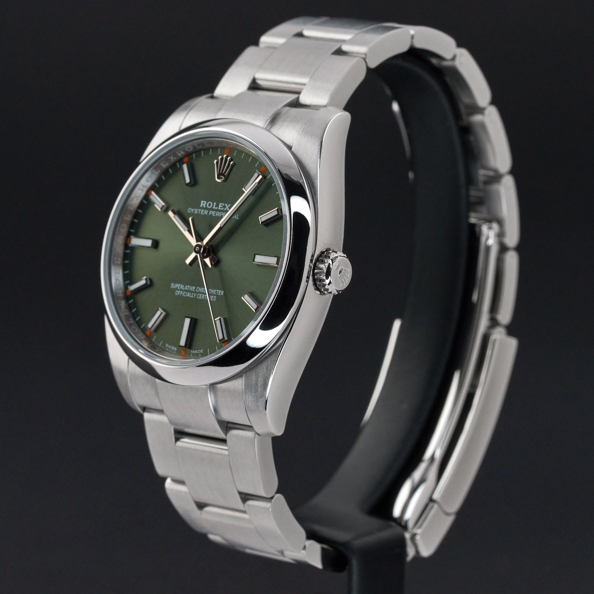This Rolex Oyster Perpetual 114200 features an Olive dial and is crafted from stainless steel, with a production year of 2019.Case No: 6Z33XXXX