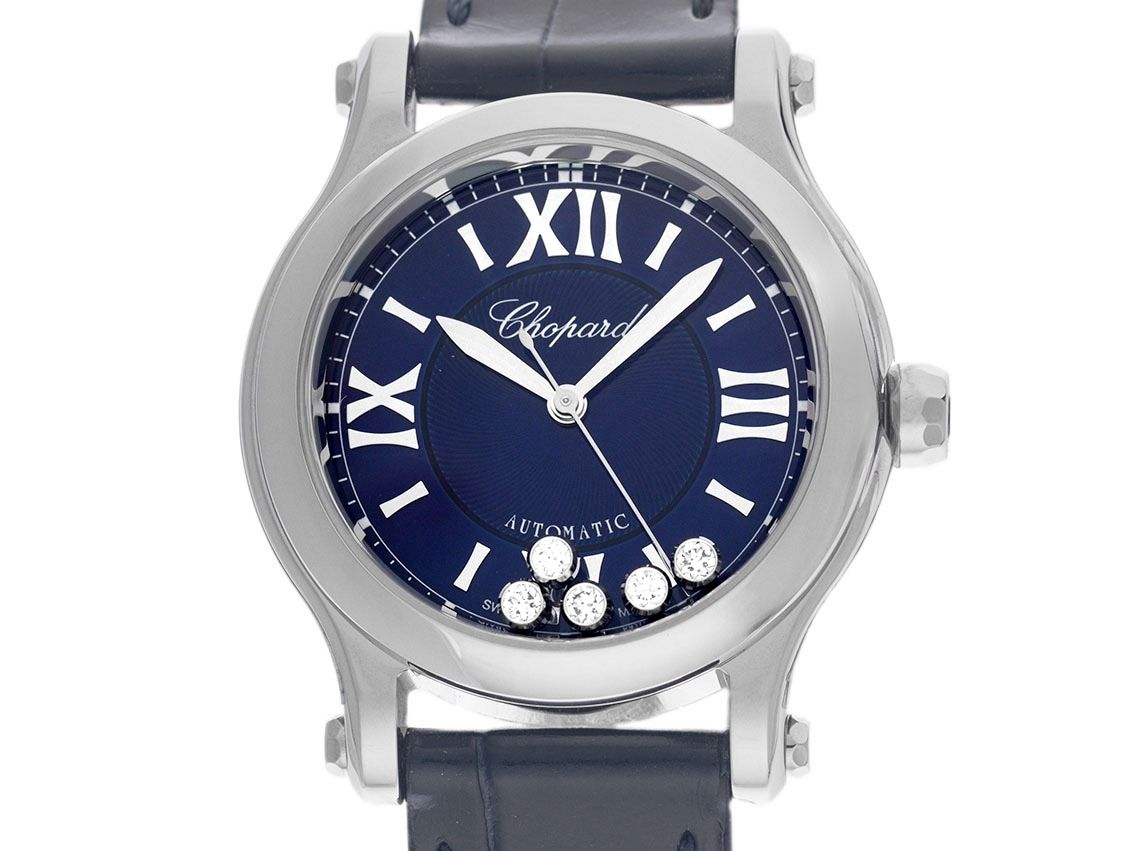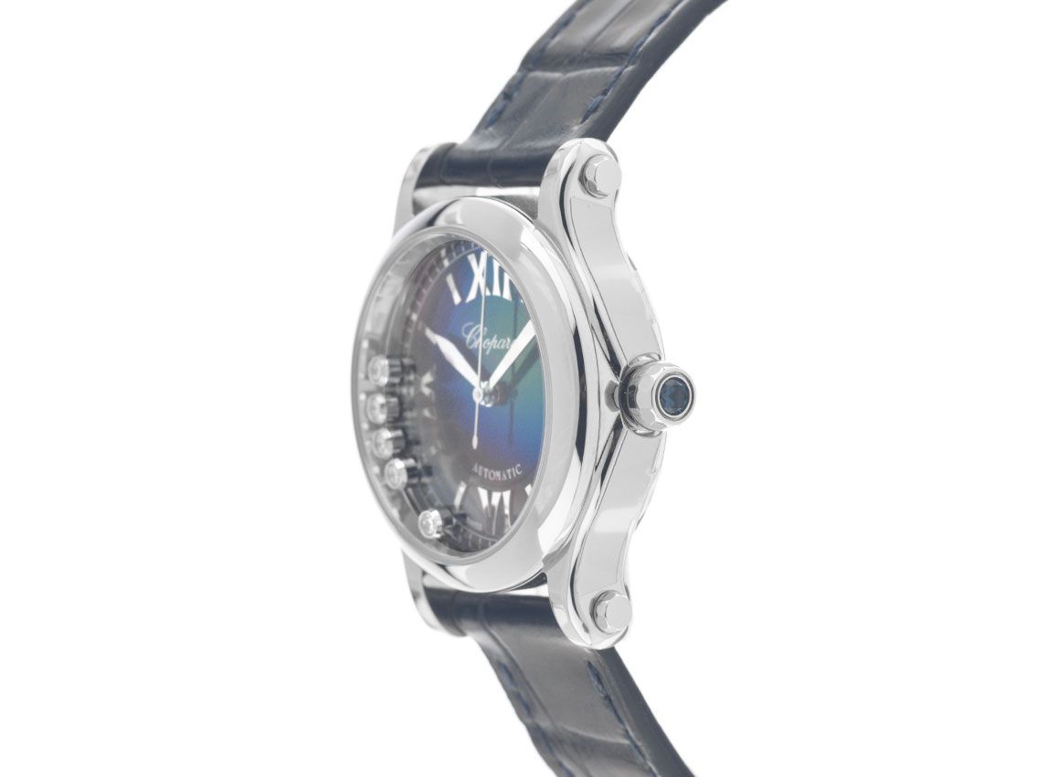 Chopard Happy Sport Stahl Diamanten Automatik Armband LederGehäuse Edelstahl poliert, Gehäusedurchmesser ohne Krone 30mm, Gehäusehöhe 11,23mm. Lünette Edelstahl glatt und poliert. Armband Leder blau mit Ziernaht, Anstoßbreite 15mm, Stiftschließe Edelstahl mit Hersteller-Logo. Zifferblatt blau mit 5 beweglichen in 18kt Weißgold gefassten Diamanten, zusammen ca. 0,75ct, aufgesetzten weißgoldenen römischen Ziffern und weißgoldenen Zeigern. Uhrwerk Automatik, Kaliber Chopard 09.01-C mit 27 Edelsteinen, Gangreserve ca. 42 Stunden. Anzeige von Stunde, Minute und Sekunde über Zeiger aus der Mitte mit Sekundenstopp zur sekundengenauen Einstellung der Uhrzeit. Saphirglas kratzfest. Krone mit Saphir. Boden Edelstahl 6-fach verschraubt und graviert mit Saphirglas Sichtfenster. Wasserdicht bis 3 ATM. Gewicht der Uhr inklusive Armband 39g. Referenznummer: 278573-3016, ID: ST1160101301225H-7600, Artikelnummer: 10000084048. Original Chopard Box mit Umkarton und Garantie Papiere von Dezember 2025 sowie Beschreibung, Full Set. Ungetragen. Lieferzeit sofort.