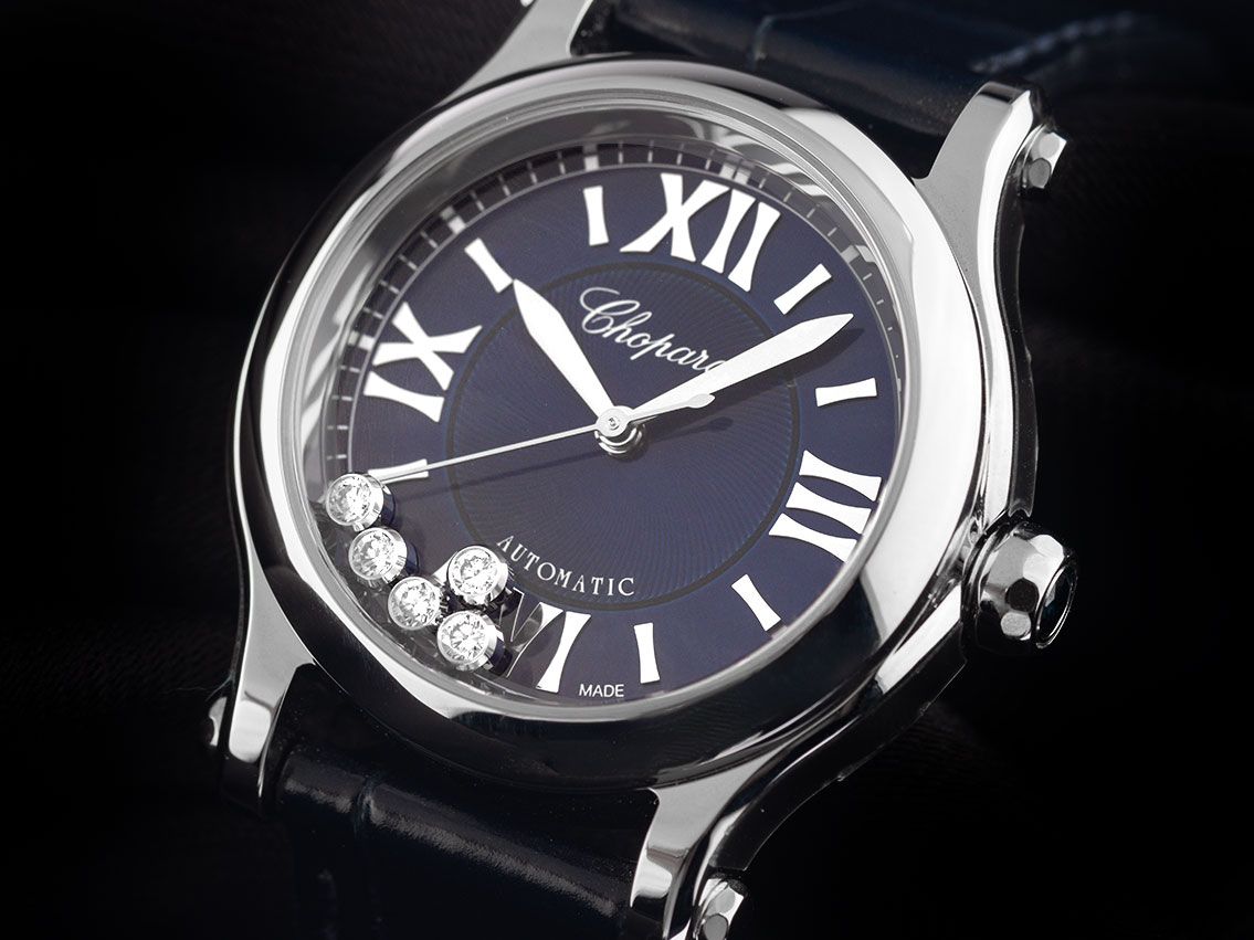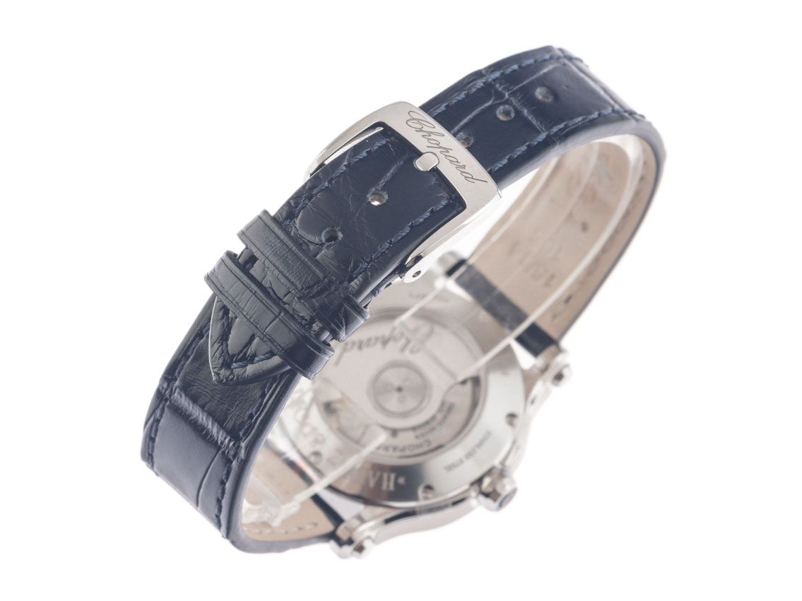 Boîtier en acier poli, diamètre du boîtier sans couronne 30mm, hauteur du boîtier 11,23mm. Lunette en acier lisse et poli. Bracelet en cuir bleu avec couture décorative, largeur d'attache 15mm, boucle ardillon en acier avec logo du fabricant. Cadran bleu avec 5 diamants mobiles sertis en or blanc 18kt, pour un total d'environ 0,75ct, chiffres romains en or blanc appliqués et aiguilles en or blanc. Mouvement automatique, calibre Chopard 09.01-C avec 27 pierres précieuses, réserve de marche d'environ 42 heures. Affichage de l'heure, des minutes et des secondes par aiguilles centrales avec arrêt des secondes pour un réglage précis de l'heure. Verre saphir résistant aux rayures. Couronne avec saphir. Fond en acier vissé 6 fois et gravé avec fenêtre en verre saphir. Étanche jusqu'à 3 ATM. Poids de la montre avec bracelet 39g. Numéro de référence : 278573-3016, ID : ST1160101301225H-7600, numéro d'article : 10000084048. Boîte Chopard d'origine avec carton d'emballage et papiers de garantie de décembre 2025 ainsi que description, ensemble complet. Non porté. Délai de livraison immédiat.