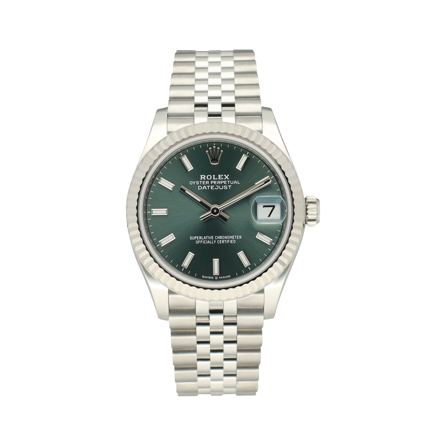 The Rolex Datejust 31 reference 278274 from 2025 is offered in brand-new, unworn condition and delivered as a Full Set, including the original box and papers. This contemporary and highly desirable configuration features a striking green dial, adding a modern and elegant touch to the timeless Datejust design.