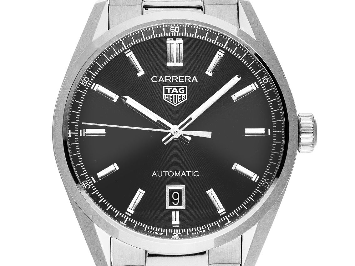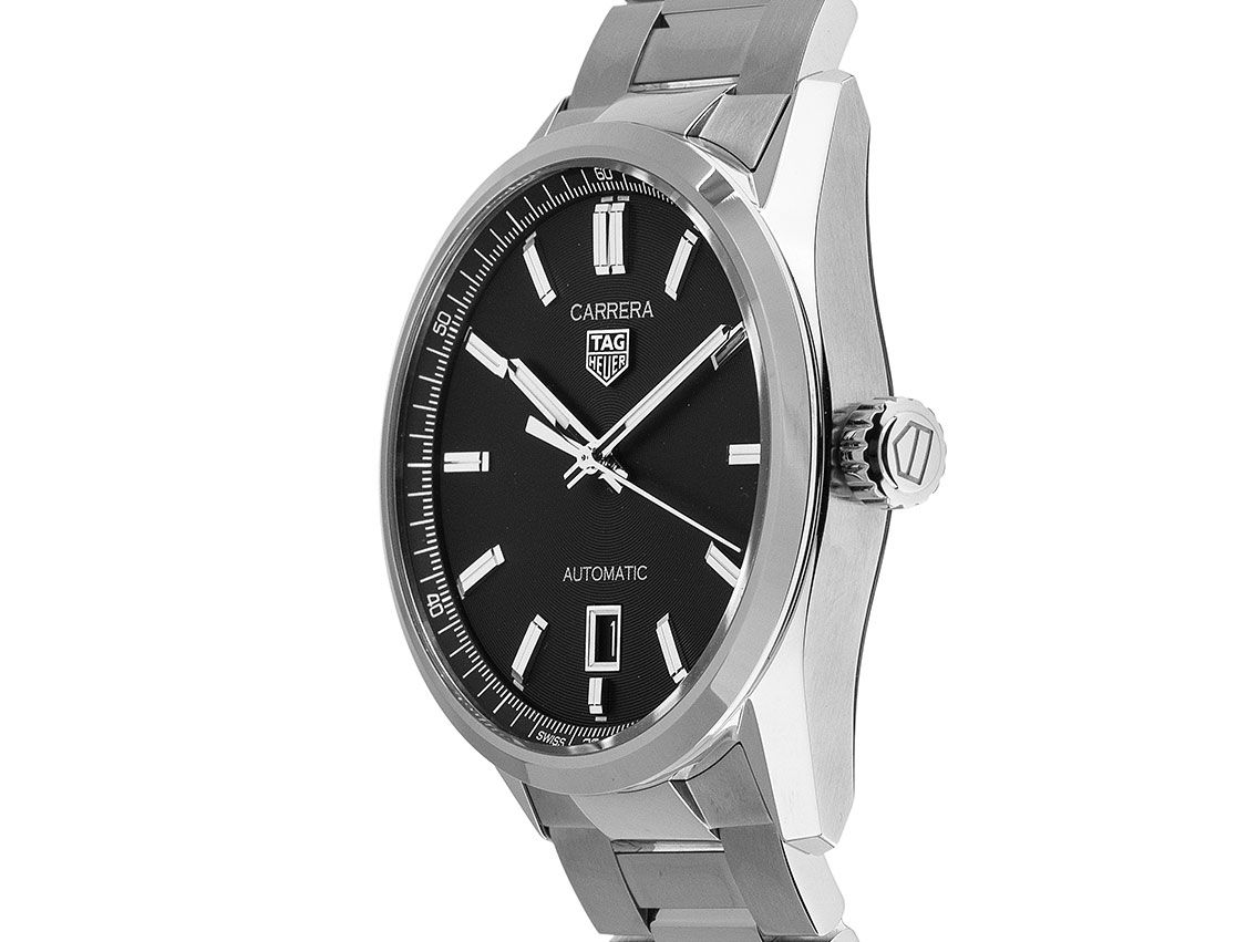 Tag Heuer Carrera Calibre 5 Stahl Automatik Armband StahlGehäuse Edelstahl poliert, Gehäusedurchmesser ohne Krone 39mm, Gehäusehöhe 11,5mm. Lünette Edelstahl glatt und poliert. Armband Edelstahl poliert und satiniert, Sicherheitsfaltschließe Edelstahl mit Hersteller-Logo. Zifferblatt schwarz mit aufgesetzten Edelstahl Indexen und polierten Edelstahl Leuchtzeigern. Uhrwerk Automatik, Kaliber Tag Heuer Calibre 5 mit 26 Edelsteinen, Gangreserve ca. 38 Stunden. Anzeige von Stunde, Minute und Sekunde über Zeiger aus der Mitte mit Sekundenstopp zur sekundengenauen Einstellung der Uhrzeit, Datumsanzeige mit Schnellverstellung bei 6 Uhr. Saphirglas kratzfest und gewölbt. Krone mit Hersteller-Logo. Boden Edelstahl verschraubt und graviert mit Saphirglas Sichtfenster. Gewicht der Uhr inklusive Armband 127g, Länge des Armbandes inklusive Gehäuse 200mm. Wasserdicht bis 10 ATM. Referenznummer: WBN2110.BA0639, ID: ST116056721225H-3550, Artikelnummer: 10000084099. Original Tag Heuer Box mit Umkarton und Garantie Papiere von 2025, Full Set. Ungetragen. Lieferzeit sofort.