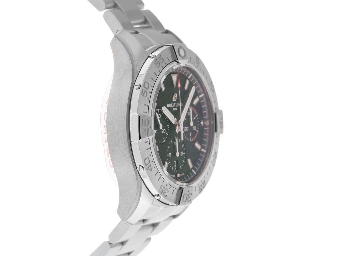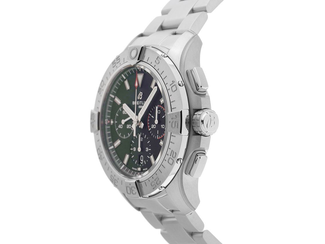 Breitling Avenger B01Chrongraph Stahl Automatik Armband StahlGehäuse Edelstahl satiniert, Gehäusedurchmesser ohne Krone 42mm, Gehäusehöhe 15,5mm. Lünette Edelstahl satiniert mit 60-Minuten Skala und Leuchtpunkt, einseitig drehbar. Armband Edelstahl satiniert, Sicherheitsfaltschließe Edelstahl mit Hersteller-Logo. Zifferblatt grün mit aufgesetzten Leuchtindexen und Leuchtzeigern. Uhrwerk Automatik, Chronograph, Chronometer mit Zeugnis, Breitling Manufakturkaliber 01 mit 45 Edelsteinen, Gangreserve ca. 70 Stunden. Anzeige von Stunde und Minute über Zeiger aus der Mitte, kleine Sekunde mit Sekundenstopp zur sekundengenauen Einstellung der Uhrzeit bei 9 Uhr, Datumsanzeige mit Schnellverstellung bei 6 Uhr. Saphirglas kratzfest, beidseitig entspiegelt und bombiert. Krone verschraubbar mit Flankenschutz und Hersteller-Logo. Boden Edelstahl verschraubt und graviert mit Saphirglas Sichtfenster. Gewicht der Uhr inklusive Armband 196g, Länge des Armbandes inkl. Gehäuse 195mm. Wasserdicht bis 30 ATM. Referenznummer: AB0146101L1A1, ID: ST116099380126H-7200, Artikelnummer: 10000084193. Original Breitling Box und Garantie Papiere von 2025 sowie Beschreibung, Full Set. Ungetragen. Lieferzeit sofort.