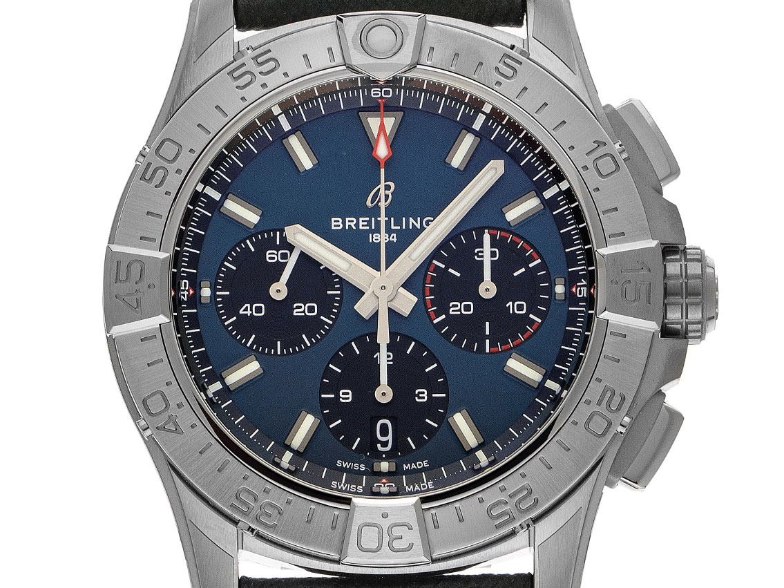 Breitling Avenger B01 Stahl Automatik Armband Leder FaltschließeGehäuse Edelstahl satiniert, Gehäusedurchmesser ohne Krone 42mm, Gehäusehöhe 15,2mm. Lünette Edelstahl poliert und satiniert mit 60-Minuten Skala und Leuchtpunkt, einseitig drehbar. Armband Leder grün mit Ziernaht, Anstoßbreite 22mm, Sicherheitsfaltschließe Edelstahl mit Hersteller-Logo. Zifferblatt blau mit aufgesetzten Leuchtindexen und Leuchtzeigern. Uhrwerk Automatik, Chronograph, Chronometer mit Zeugnis, Breitling Manufakturkaliber 01 mit 45 Edelsteinen, Gangreserve ca. 70 Stunden. Anzeige von Stunde und Minute über Zeiger aus der Mitte, kleine Sekunde mit Sekundenstopp zur sekundengenauen Einstellung der Uhrzeit bei 9 Uhr, Datumsanzeige mit Schnellverstellung bei 6 Uhr. Saphirglas kratzfest und beidseitig entspiegelt. Krone verschraubbar mit Flankenschutz und Hersteller-Logo. Boden Edelstahl verschraubt und graviert mit Saphirglas Sichtfenster. Gewicht der Uhr inklusive Armband 126g. Wasserdicht bis 30 ATM. Referenznummer: AB0146101C1X1, ID: ST116095240126H-6900, Artikelnummer: 10000084196. Original Breitling Box und Garantie Papiere von 2025 sowie Beschreibung, Full Set. Ungetragen. Lieferzeit sofort.