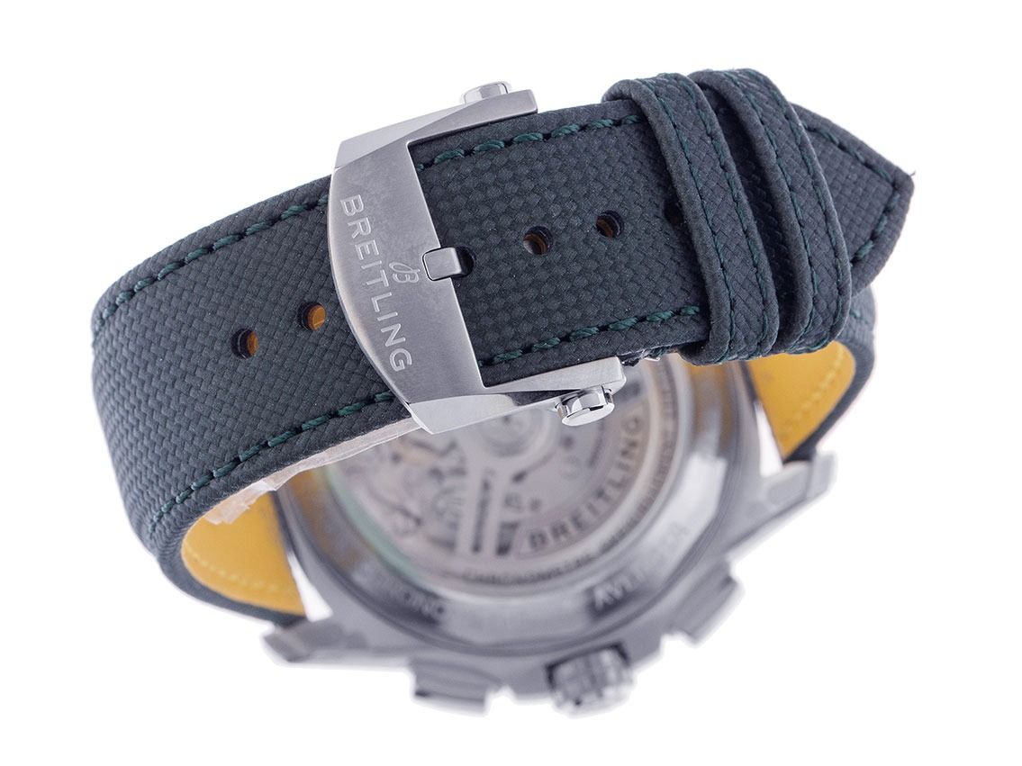 Boîtier en acier inoxydable satiné, diamètre du boîtier sans couronne 42mm, hauteur du boîtier 15,2mm. Lunette en acier poli et satiné avec échelle de 60 minutes et point lumineux, unidirectionnelle. Bracelet en cuir vert avec surpiqûre, largeur des cornes 22mm, boucle déployante de sécurité en acier inoxydable avec logo du fabricant. Cadran bleu avec index lumineux appliqués et aiguilles lumineuses. Mouvement automatique, chronographe, chronomètre avec certificat, calibre manufacture Breitling 01 avec 45 pierres précieuses, réserve de marche d'environ 70 heures. Affichage des heures et des minutes par aiguilles centrales, petite seconde avec stop-seconde pour un réglage précis de l'heure à 9 heures, affichage de la date avec réglage rapide à 6 heures. Verre saphir résistant aux rayures et anti-reflets des deux côtés. Couronne vissée avec protection latérale et logo du fabricant. Fond en acier vissé et gravé avec fenêtre en verre saphir. Poids de la montre avec bracelet 126g. Étanche jusqu'à 30 ATM. Numéro de référence : AB0146101C1X1, ID : ST116095240126H-6900, numéro d'article : 10000084196. Boîte Breitling originale et papiers de garantie de 2025 ainsi que description, Full Set. Non porté. Délai de livraison immédiat.