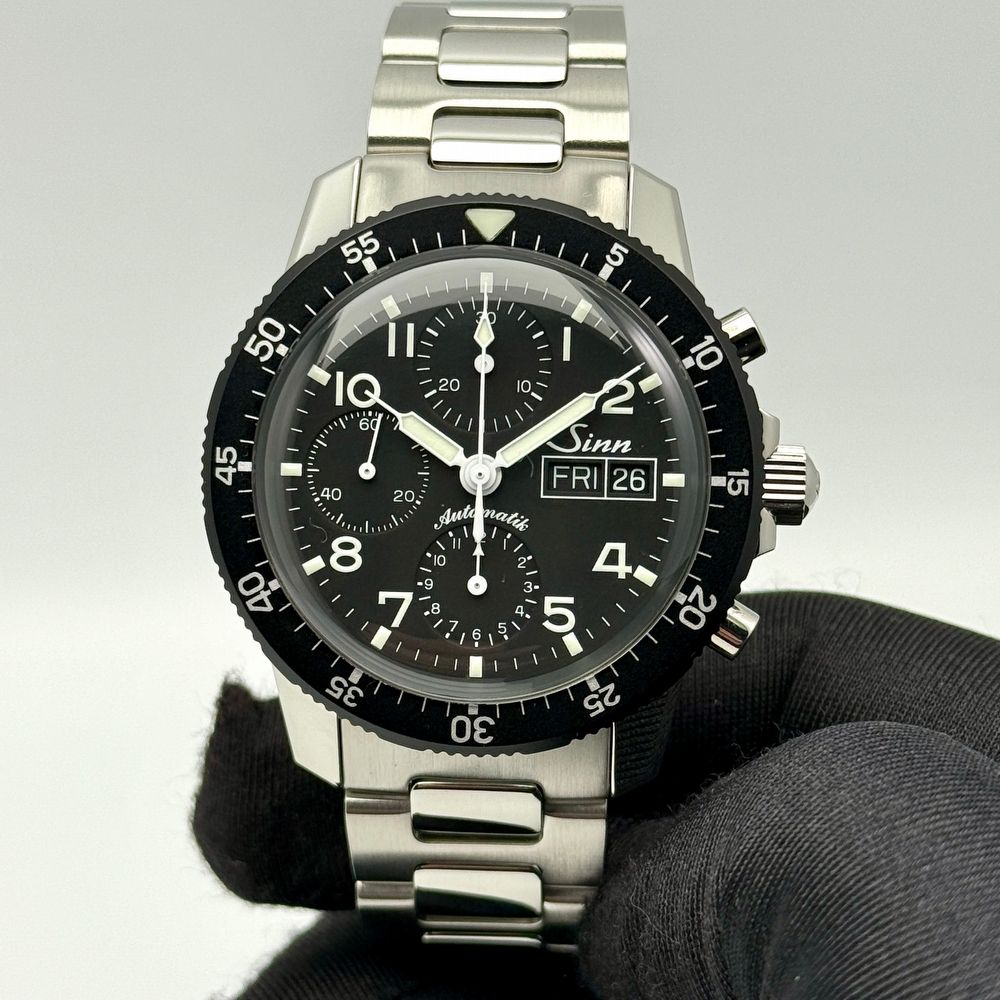 Founded in 1961 in Frankfurt am Main, Germany, Sinn Spezialuhren is renowned for producing highly functional instrument watches designed for professional use. The brand is celebrated for its engineering-driven approach, clarity of design, and uncompromising focus on reliability. The 103 collection is one of Sinn’s most iconic chronograph lines, closely associated with aviation and classic pilot chronographs.The Sinn 103 ST Chronograph, reference 103.035, features a 41 mm stainless steel case with a matte black dial, white Arabic numerals, and high-contrast chronograph subdials for outstanding legibility. Powered by the automatic Sellita SW510 movement (based on the Valjoux 7750 architecture), it offers a 48-hour power reserve, a frequency of 28,800 vph, and functions including central chronograph seconds, 30-minute and 12-hour counters, small seconds, day-date display at 3 o’clock, and hacking seconds.