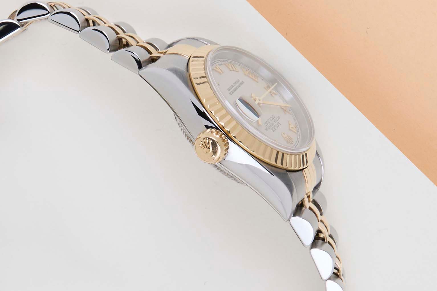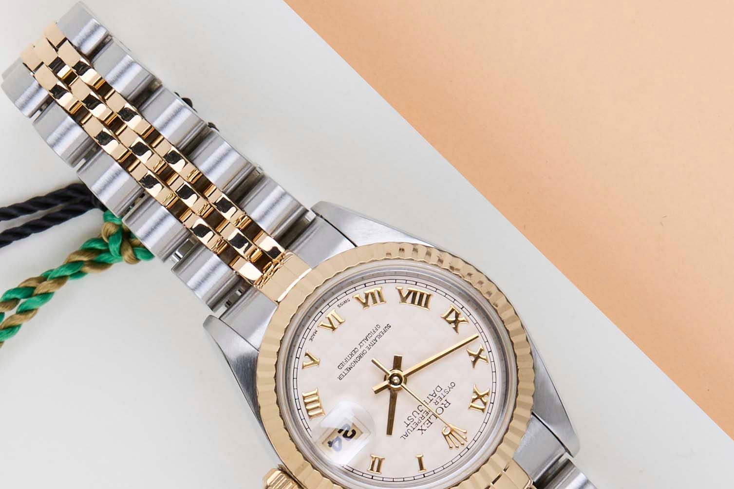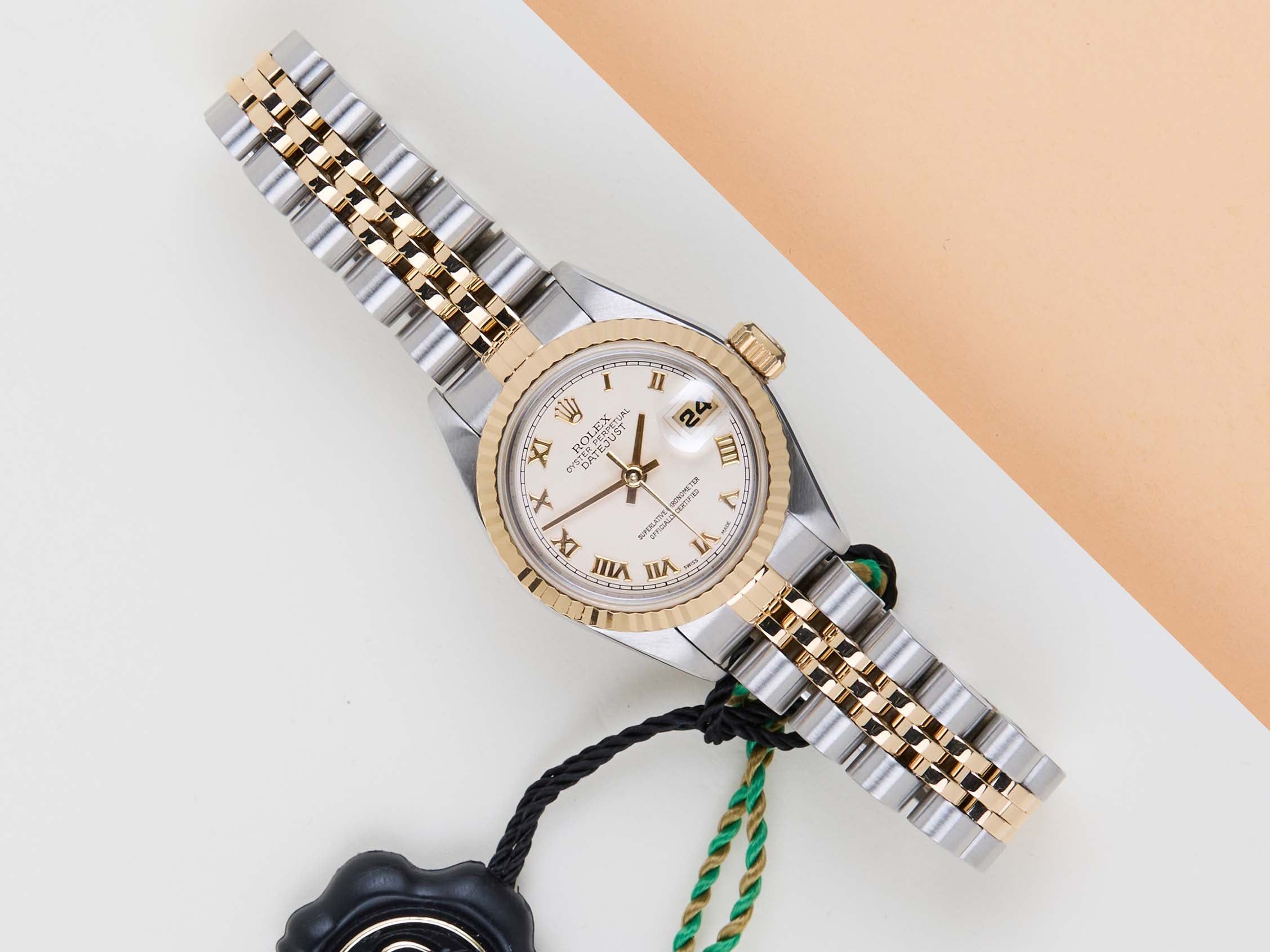 Full-Set | Rare Original Pyramid Roman DialRolex introduced the original Datejust in 1945 to celebrate the company's 40th anniversary. Due to the enormous success, Rolex released the first Lady-Datejust in 1957.This Rolex Datejust 'White Pyramid Roman Dial' was sold for the first time in January 1997.This Datejust is made out of a combination of 18k Yellow Gold and stainless steel and is fitted with a jubilee bracelet.This Rolex Datejust 26 is in Mint condition and comes with the original Rolex Warranty Papers and box. Furthermore, the watch has been serviced by our watchmaker, and therefore it comes with one year of warranty.
