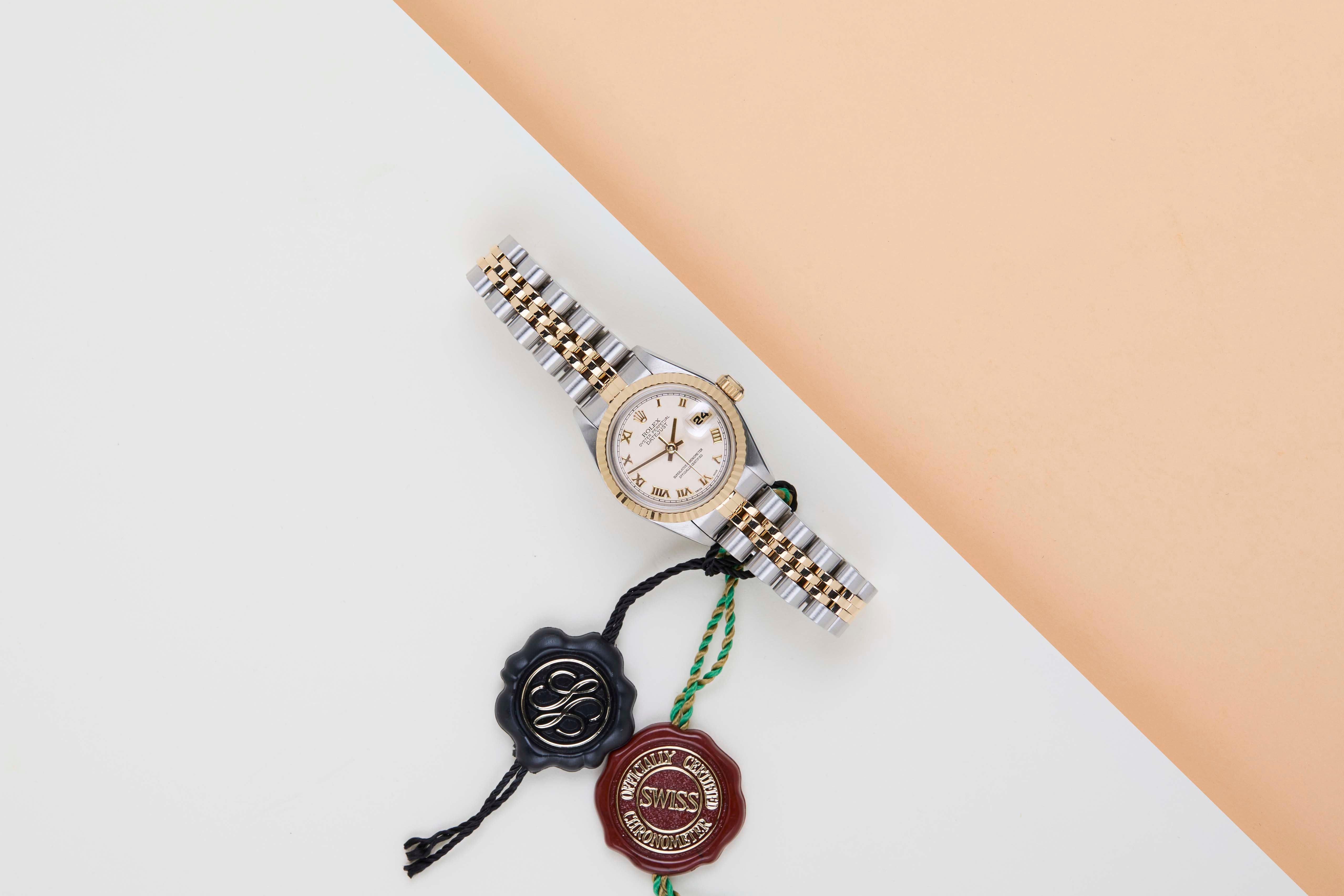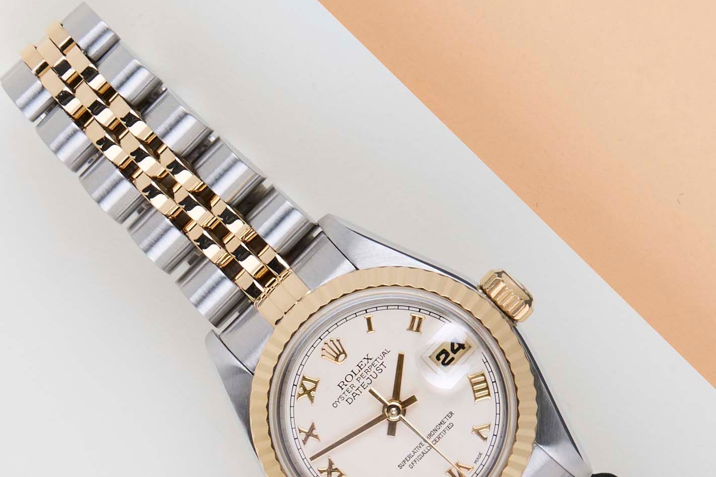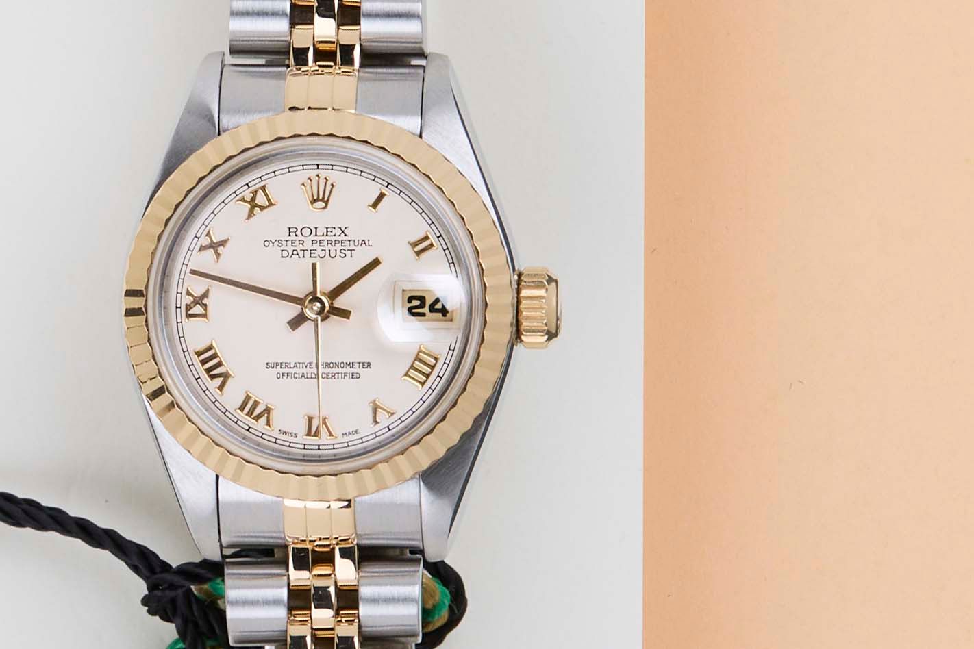 Full-Set | Rare Original Pyramid Roman DialRolex introduced the original Datejust in 1945 to celebrate the company's 40th anniversary. Due to the enormous success, Rolex released the first Lady-Datejust in 1957.This Rolex Datejust 'White Pyramid Roman Dial' was sold for the first time in January 1997.This Datejust is made out of a combination of 18k Yellow Gold and stainless steel and is fitted with a jubilee bracelet.This Rolex Datejust 26 is in Mint condition and comes with the original Rolex Warranty Papers and box. Furthermore, the watch has been serviced by our watchmaker, and therefore it comes with one year of warranty.