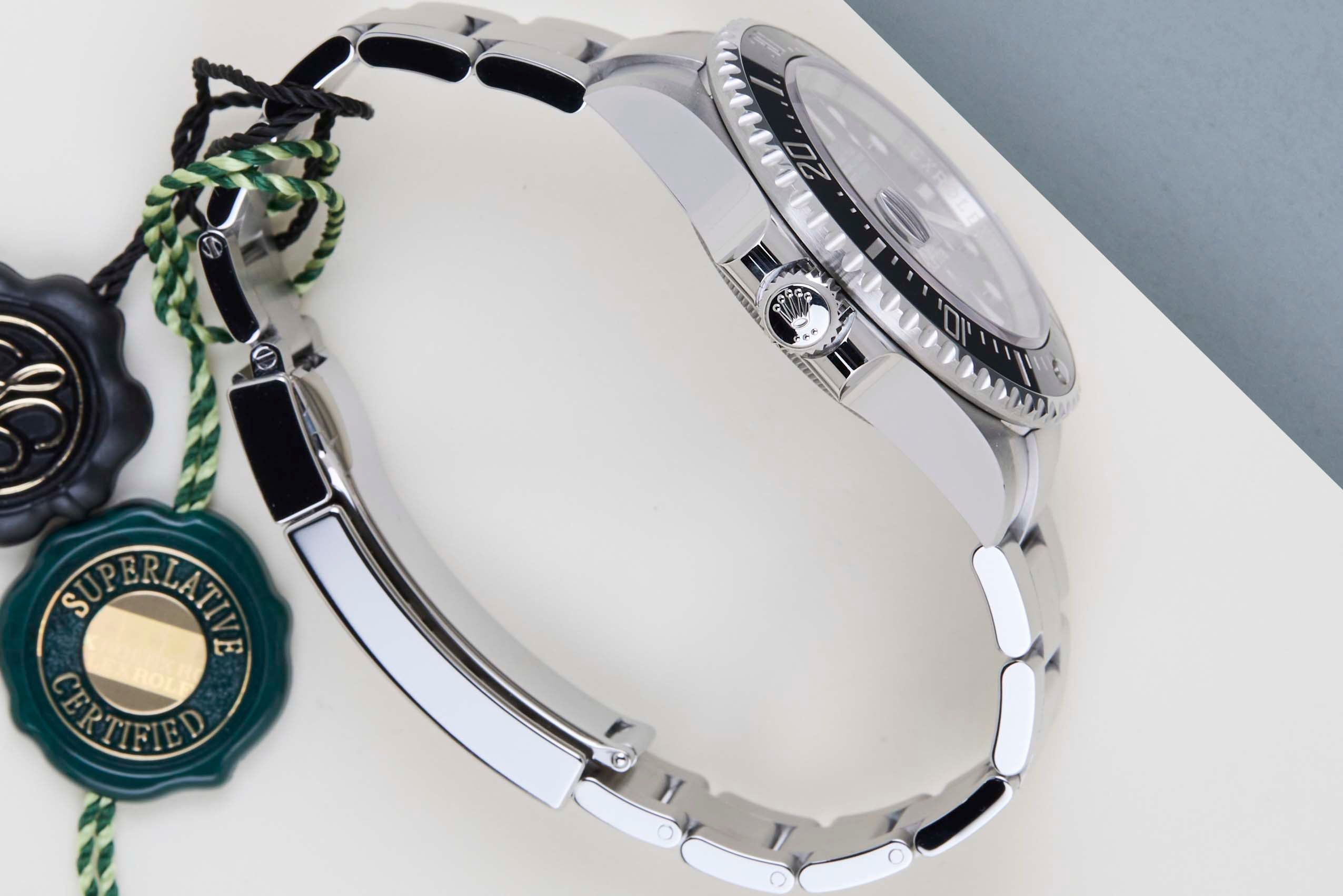 Full Set | Unpolished Condition | International Rolex Warranty Until February 2029The Sea-Dweller was launched in the late 1960s as a professional diver, waterproof to a depth of 610 meters – more than triple what the Submariner guaranteed at the time. The feat was achieved thanks to a bulkier case and the introduction of a helium escape valve that helped regulate the pressure accumulated in the case.For the 50th anniversary, Rolex has introduced this new Sea-Dweller Reference 126600, and this one's a bit different than its predecessors. The new Sea-Dweller comes in a 43mm steel case, making it the largest non-Deep Sea model, going all the way back to 1967.The uni-directional bezel on the new model is black Cerachrom, and the graduation is coated with a thin layer of platinum. The hour markers and hands are filled with blue Chromalight. At the last, the most significant change is the addition of a magnifying glass, aka the Cyclops, above the date.This reference 126600 is equipped with the new-generation Caliber 3235. The new Caliber 3235 has a power reserve of 70 hours and the movement has a -/+ 2 seconds per day accuracy rating.This Rolex Sea Dweller 43 is Mint condition and comes with the original Rolex Warranty Card and Original Box. Furthermore, the watch still has International Rolex Warranty until February 2029.