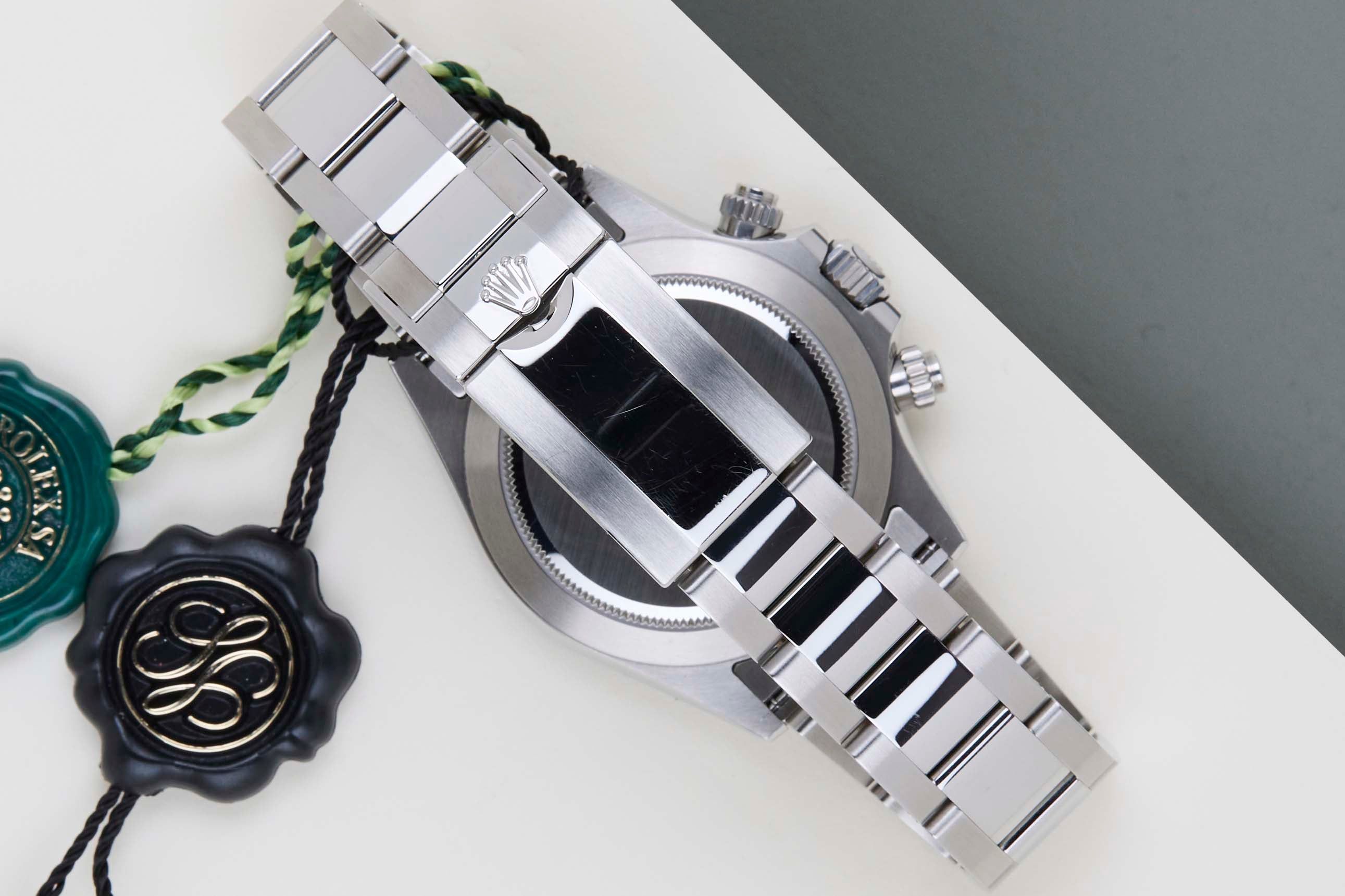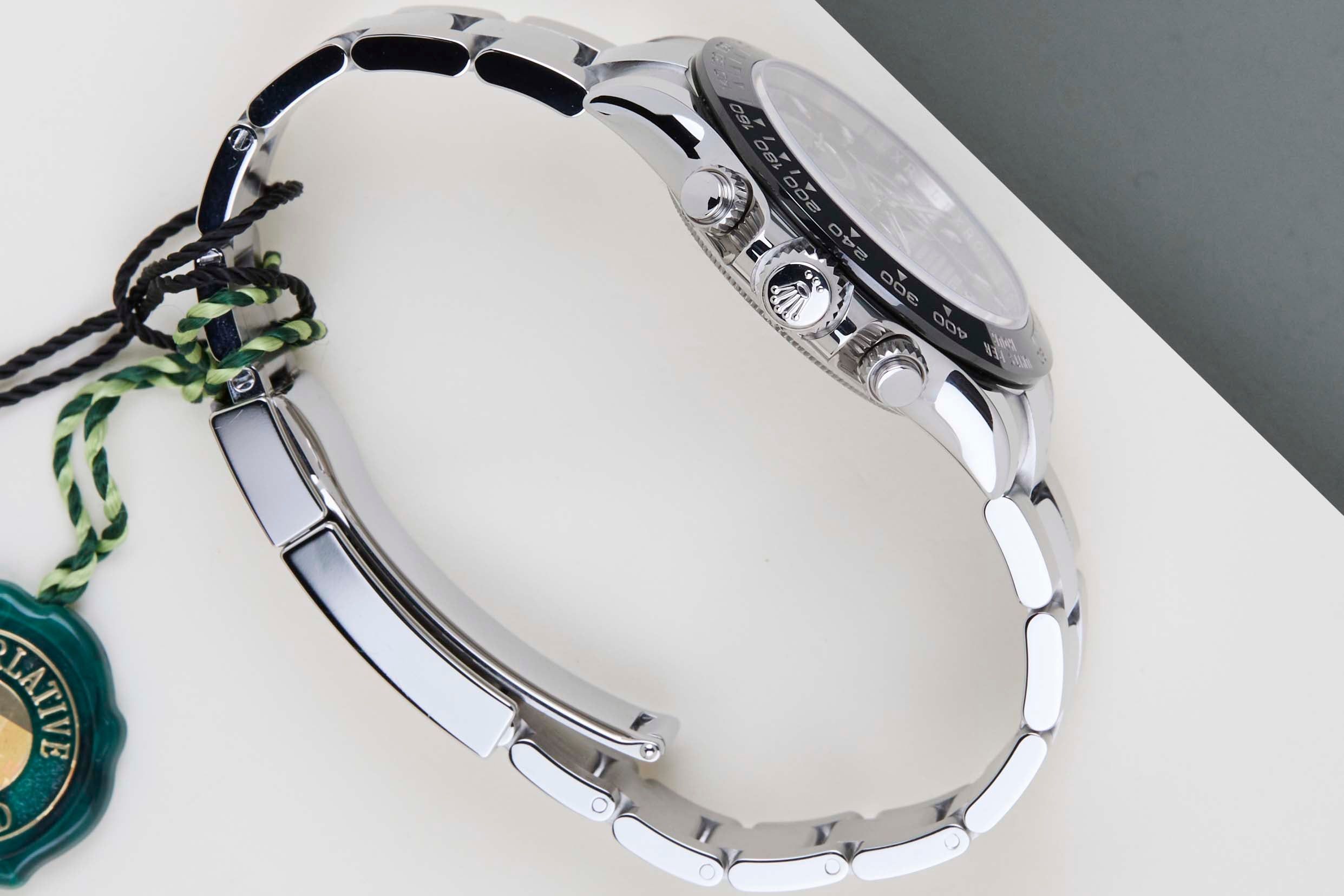 Cette Rolex Daytona 116500LN est en état neuf et est livrée avec la carte de garantie Rolex d'origine et la boîte. De plus, la montre bénéficie d'une garantie Rolex mondiale jusqu'en octobre 2028.