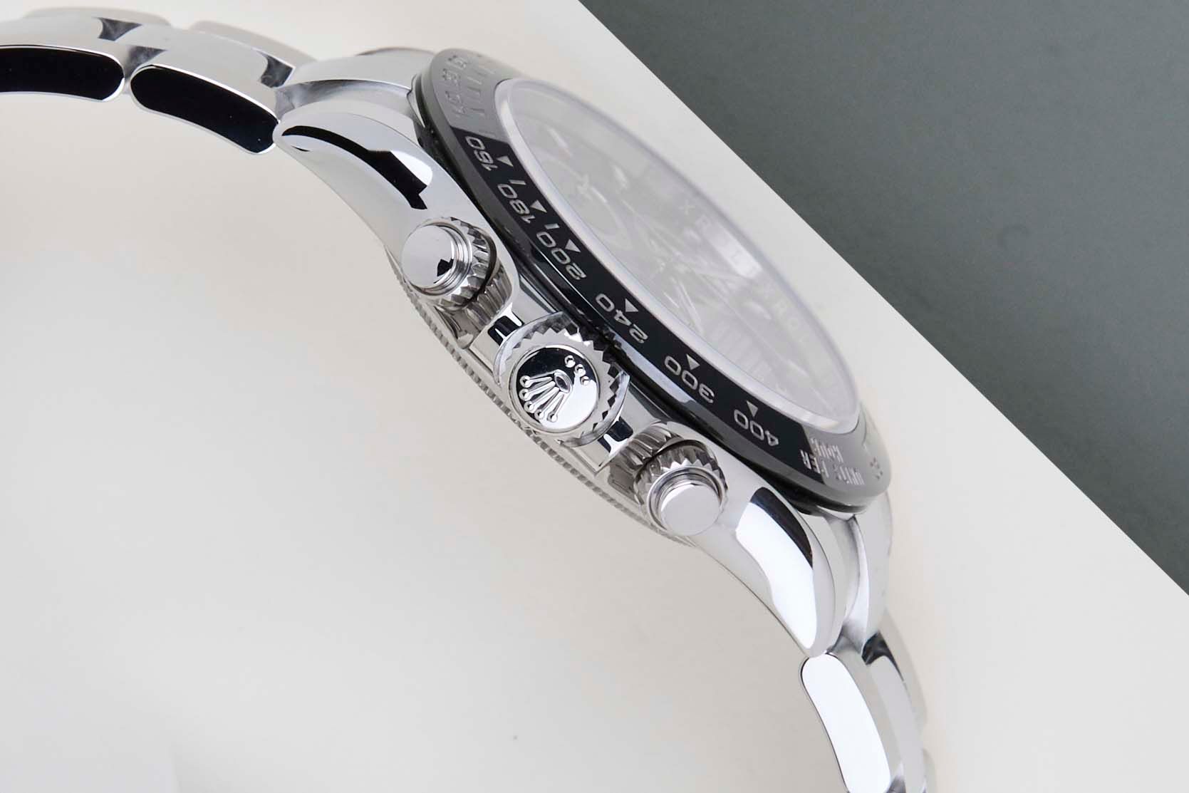 La référence 116500LN est la première génération de la Daytona avec une lunette en céramique. Le matériau utilisé pour fabriquer cette lunette s'appelle 'Cerachrom', qui a été développé entièrement en interne par Rolex pour être très résistant aux rayures.