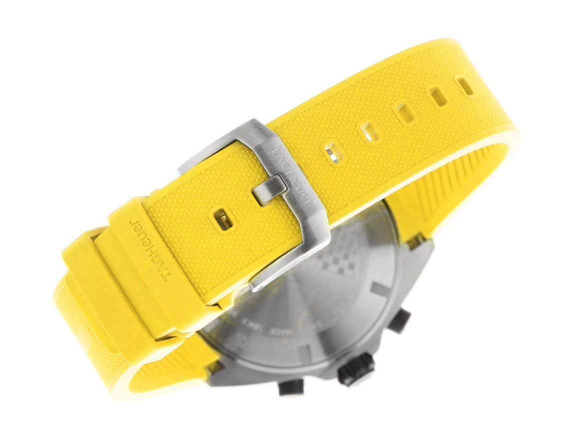 Boîtier en acier inoxydable satiné, diamètre du boîtier sans couronne 43mm, hauteur du boîtier 12,6mm. Lunette en acier PVD noir mat, échelle tachymétrique, unidirectionnelle. Bracelet en caoutchouc jaune, largeur des cornes 22mm, boucle à ardillon en acier inoxydable avec logo du fabricant. Cadran jaune avec sous-cadrans noirs, index en acier inoxydable appliqués et aiguilles lumineuses en acier inoxydable poli. Mouvement à quartz, chronographe. Affichage de l'heure et des minutes par aiguilles centrales, petite seconde avec stop-seconde pour un réglage précis de l'heure à 3 heures, affichage de la date avec réglage rapide à 4 heures. Verre saphir résistant aux rayures. Couronne vissée avec protection latérale et logo du fabricant. Fond en acier vissé et gravé avec le relief Tag Heuer. Poids de la montre avec bracelet 122g. Étanche jusqu'à 20 ATM. Numéro de référence : CAZ101AM.FT8054, ID : KM177317000126H-2350, numéro d'article : 10000084358. Avec contrôle de marche et révision extérieure complète de janvier 2026. Boîte d'origine Tag Heuer avec carton d'emballage et papiers de garantie de mai 2024 ainsi que description et extrait du registre des montres de janvier 2026, certificat The Watch Register / sans inscription (base de données internationale pour montres perdues ou volées), ensemble complet. Comme neuf. Délai de livraison immédiat.