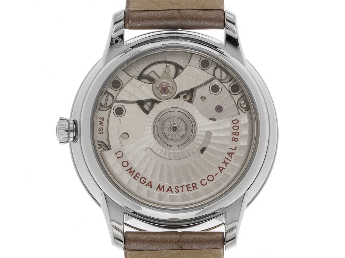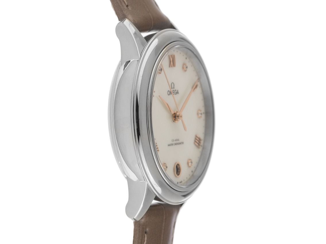 Boîtier en acier inoxydable poli, diamètre du boîtier sans couronne 34mm, hauteur du boîtier 10,1mm. Lunette en acier lisse et poli. Bracelet en cuir taupe avec couture décorative, largeur de l'attache 16mm, boucle à ardillon en acier inoxydable avec logo du fabricant. Cadran en nacre avec chiffres romains en rose gold appliqués, 6 index en diamant appliqués et aiguilles en rose gold. Mouvement automatique, chronomètre avec certificat, calibre Omega 8800 avec 35 pierres précieuses, réserve de marche d'environ 55 heures. Affichage de l'heure, des minutes et des secondes par aiguilles centrales avec arrêt des secondes pour un réglage précis de l'heure, affichage de la date avec réglage rapide à 6 heures. Verre saphir résistant aux rayures et bombé. Couronne cannelée avec logo du fabricant. Fond en acier inoxydable vissé et gravé avec fenêtre en verre saphir. Poids de la montre avec bracelet 44g. Numéro de référence : 434.13.34.20.55.001, ID : ST116081440126H-5700, numéro d'article : 10000084376. Boîte Omega originale avec carton d'emballage et papiers de garantie de janvier 2026 ainsi que description, Full Set. Non porté. Délai de livraison immédiat.