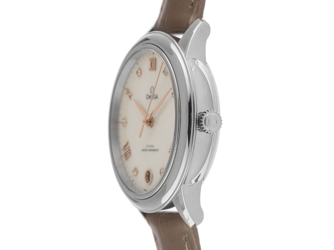 Omega De Ville Prestige Stahl Diamanten Perlmutt Automatik Armband LederGehäuse Edelstahl poliert, Gehäusedurchmesser ohne Krone 34mm, Gehäusehöhe 10,1mm. Lünette Edelstahl glatt und poliert. Armband Leder Taupe mit Ziernaht, Anstoßbreite 16mm, Omega Stiftschließe Edelstahl mit Hersteller-logo. Zifferblatt Perlmutt mit aufgesetzten roségoldenen römischen Ziffern, 6 aufgesetzten Diamantindexen und roségoldenen Zeigern. Uhrwerk Automatik, Chronometer mit Zeugnis, Omega Manufakturkaliber 8800 mit 35 Edelsteinen, Gangreserve ca. 55 Stunden. Anzeige von Stunde, Minute und Sekunde über Zeiger aus der Mitte mit Sekundenstopp zur sekundengenauen Einstellung der Uhrzeit, Datumsanzeige mit Schnellverstellung bei 6 Uhr. Saphirglas kratzfest und gewölbt. Krone geriffelt mit Hersteller-Logo. Boden Edelstahl verschraubt und graviert mit Saphirglas Sichtfenster. Gewicht der Uhr inklusive Armband 44g. Referenznummer: 434.13.34.20.55.001, ID: ST116081440126H-5700, Artikelnummer: 10000084376. Original Omega Box mit Umkarton und Garantie Papiere von Januar 2026 sowie Beschreibung, Full Set. Ungetragen. Lieferzeit sofort.