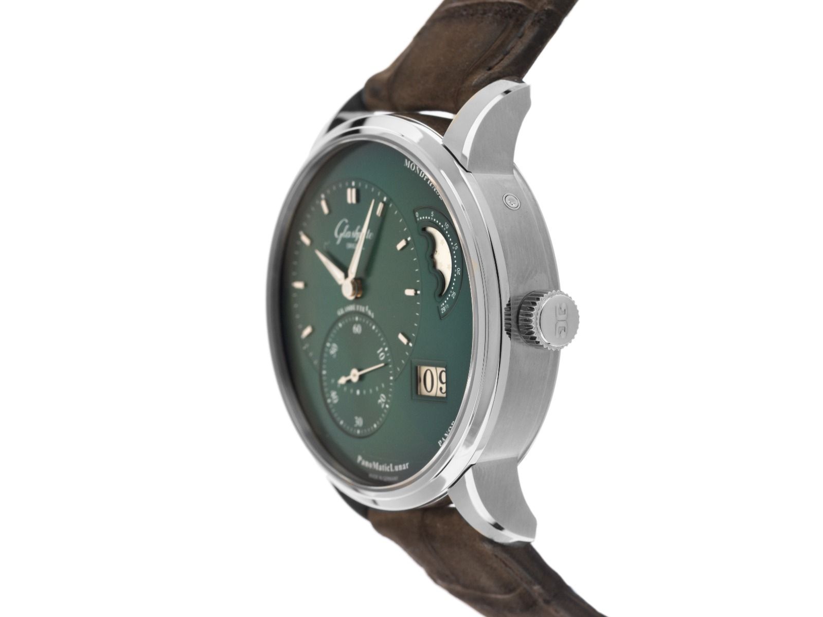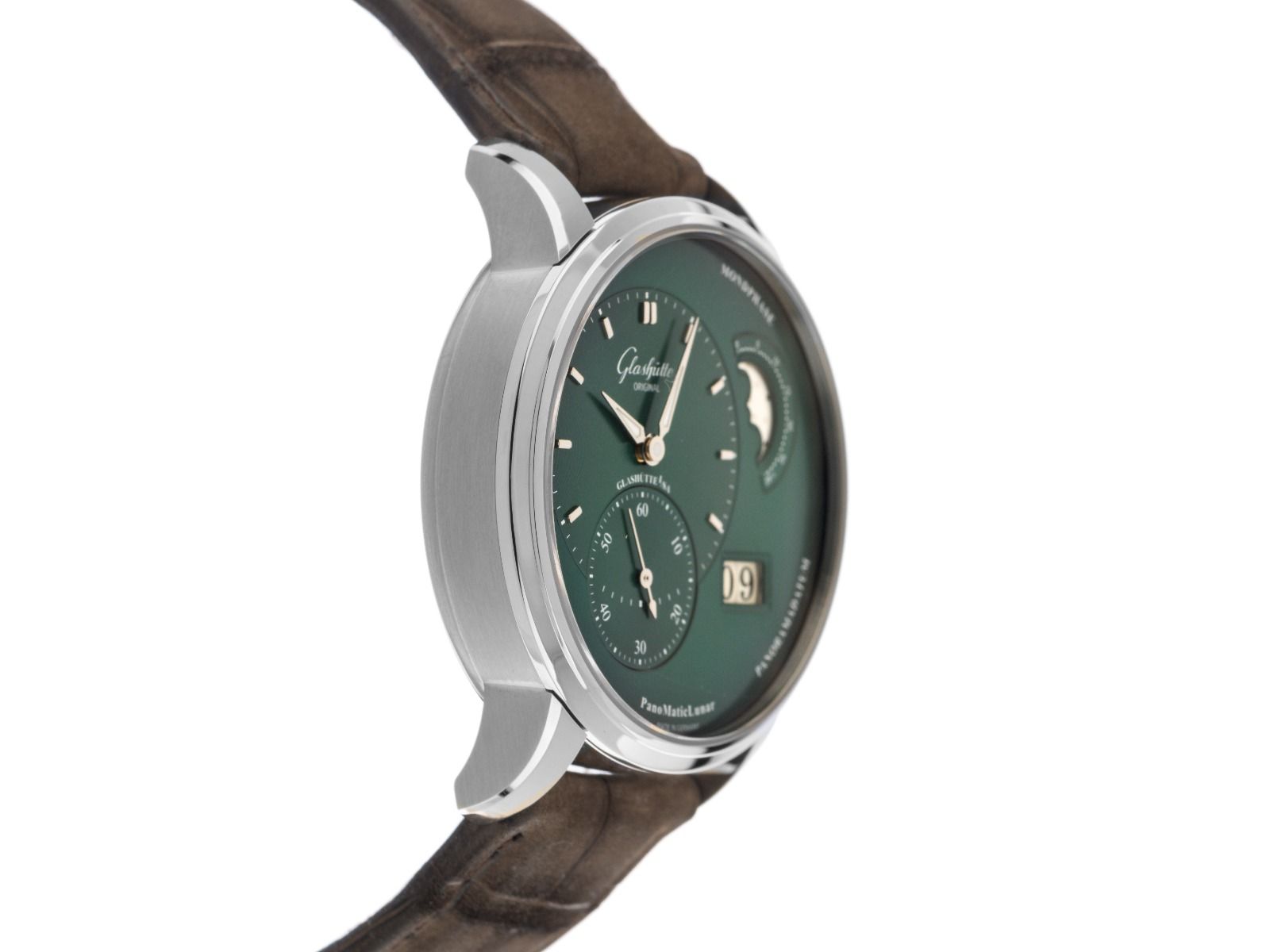 Boîtier en acier poli et satiné, diamètre du boîtier sans couronne 40mm, hauteur du boîtier 12,7mm. Lunette en acier lisse et poli. Bracelet en cuir croco brun Glashütte Original avec surpiqûre, largeur de l'entrecorne 20mm, boucle déployante en acier avec logo du fabricant. Cadran vert avec index en acier appliqués et aiguilles en acier luminescentes. Mouvement automatique, calibre manufacture Glashütte Original 90-02 avec 47 pierres précieuses. Affichage décentralisé de l'heure et des minutes à 9 heures, petite seconde avec stop-seconde pour un réglage précis de l'heure à 8 heures, affichage panoramique de la date avec réglage rapide à 4 heures, affichage des phases de lune à 2 heures. Verre saphir résistant aux rayures et bombé. Couronne cannelée avec logo du fabricant. Fond en acier 5 fois vissé et gravé avec fenêtre en verre saphir. Poids de la montre avec bracelet 95g. Étanche jusqu'à 5 ATM. Numéro de référence : 1-90-02-13-32-62, ID : ST1160162700126H-11800, numéro d'article : 10000084371. Boîte originale Glashütte Original avec carton d'emballage et papiers de garantie de janvier 2026 ainsi que description et outil de réglage, Full Set. Non porté. Délai de livraison immédiat.