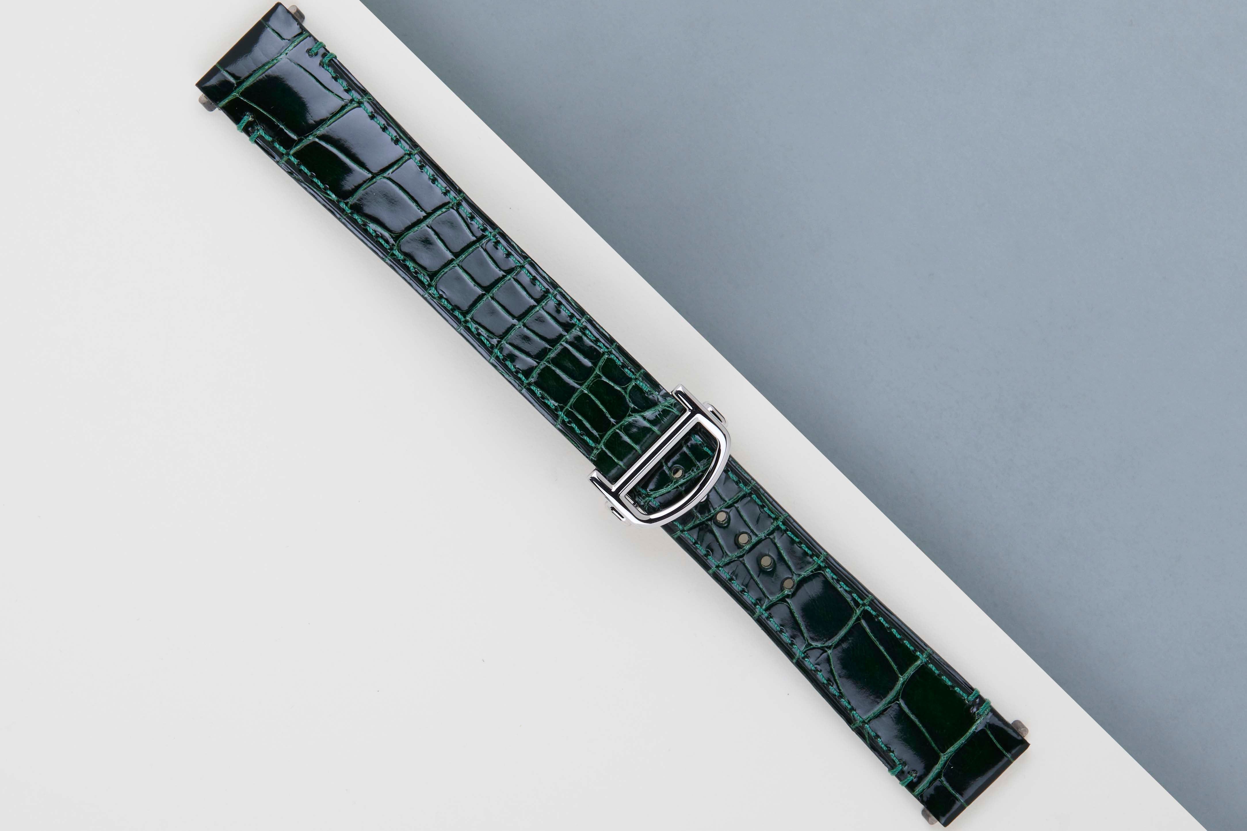 Neuf et jamais porté | Ensemble complet | Garantie internationale Cartier jusqu'en janvier 2034 | Comprend un bracelet en cuir vert Cartier et une boucle